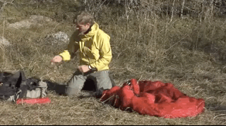 为防止被风吹跑,可以在开始搭建前先将帐篷绑在背包上,来源:Hilleberg,《Handling your Hilleberg tent in strong winds》