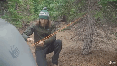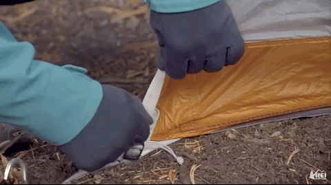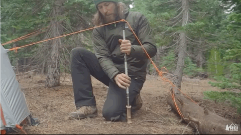 可以借助登山杖来绷劲帐篷,来源:REI,《How to Set Up a Tent》