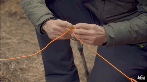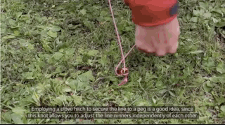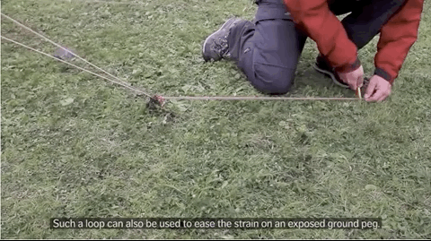 更稳固的方法是挂上后再绕一圈,或者先打一个绳结,再挂在地钉上。