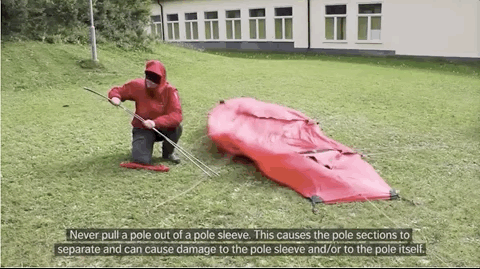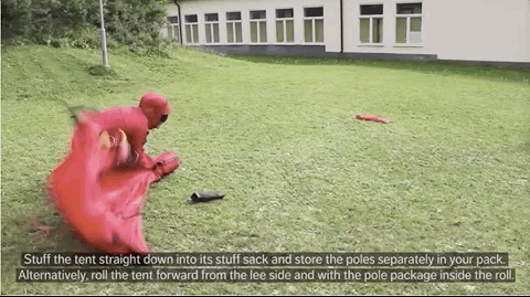 先收杖杆,再把内外账逐步塞进袋子里,来源:Hilleberg,《Handling your Hilleberg tent in strong winds》