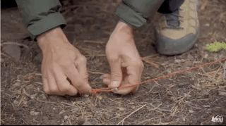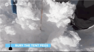 如果你是在雪地里扎营,同时又有大风,松软的雪地很难稳固地钉,此时可以把风绳缠在地钉或棍子中间位置,埋入雪地,然后把雪夯实,但不要弄湿,否则会把地钉“冻”在冰块里,第二天取不出来。