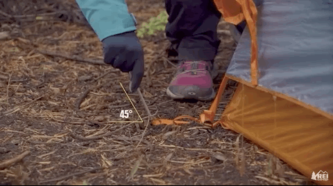 地钉不仅要与地面保持45°角,还要插入地面,来源:REI,《How to Set Up a Tent》
