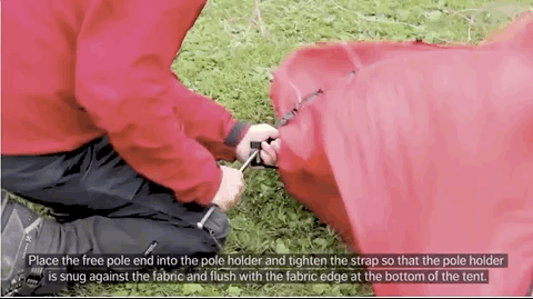 展开内帐,将内帐尾部两个织带环套在刚刚扎下的地钉上,再把帐杆插入帐尾的插扣内;