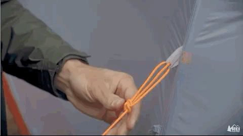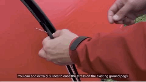 你可以在帐篷原有的风绳挂点再加一根风绳,两根风绳绷紧、呈夹角之势,可以让帐篷更抗风。