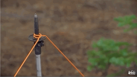 也可以把风绳系在地面的地钉或石块上,然后用倒置的登山杖撑起风绳。