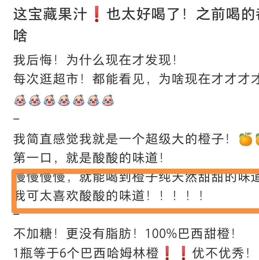 样品上架前,我们照列进行了质检,6款果汁中它得分最高,更有同事喝完当场直呼要下单,喝了二十几年的果汁饮料,尝试一下鲜榨果汁准没错。