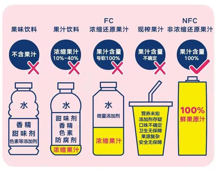 市面上的果汁饮品按照果汁含量可以分为:果味饮料、果汁饮料、FC浓缩还原果汁,鲜榨果汁和NFC非浓缩还原果汁。