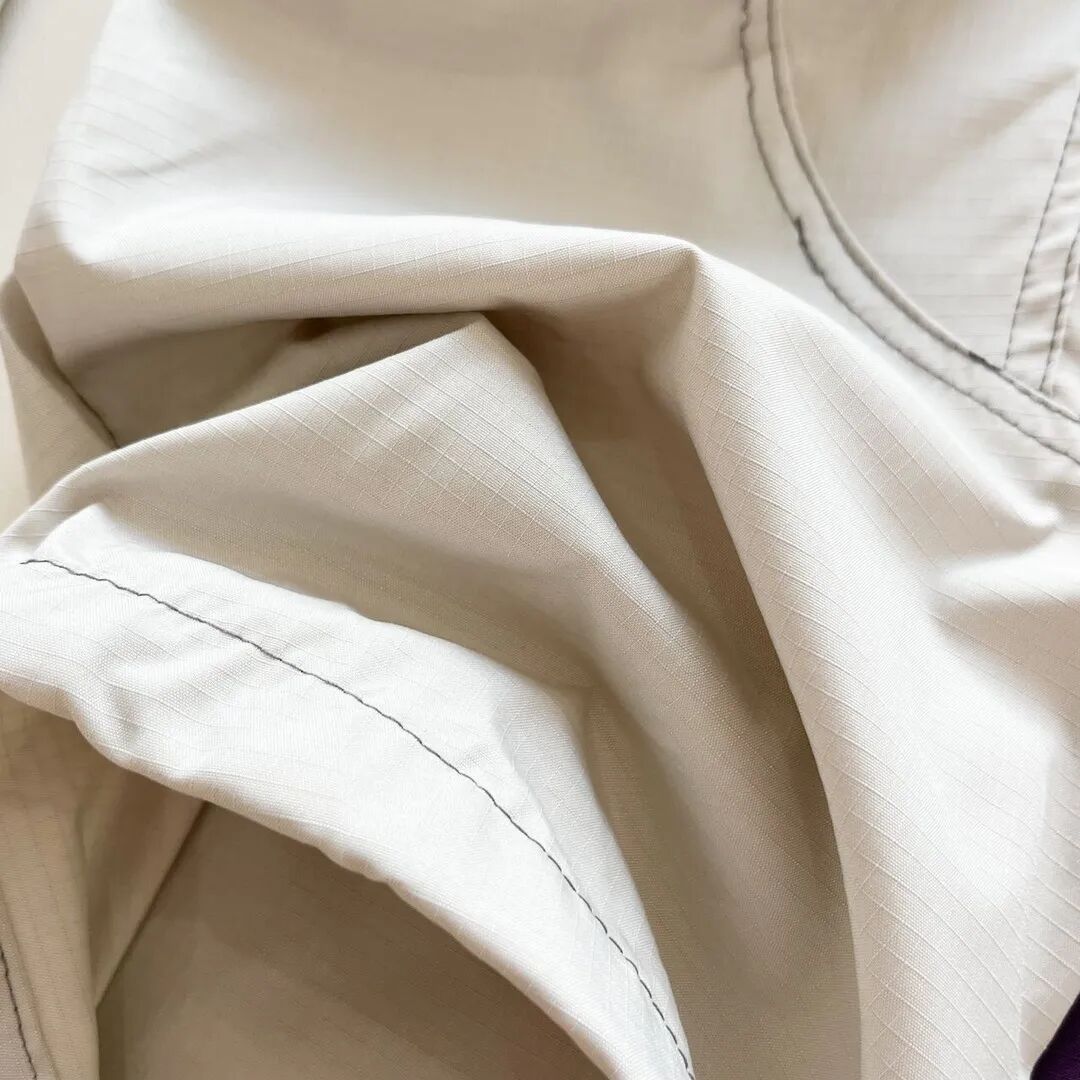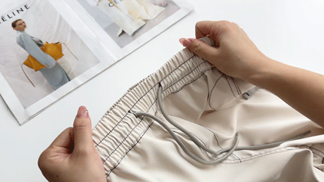整件衣服的腰带包边、接缝处走线都特别细密平滑,拿着放大镜都找不到多余的线头。
