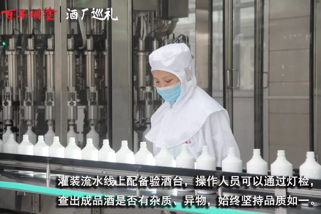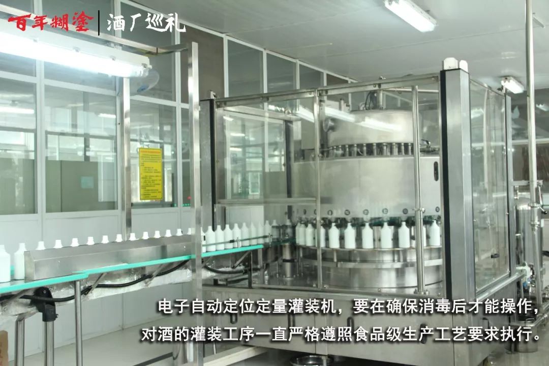 灌装室:是包装生产的关键岗位,这就是电子自动定位定量灌装机,每年必经省、市监测中心进行定量检测合格使用。按照HACCP体系要求,设立了CCP3灌装灯检关键控制点,与车间其它区域隔离分开,是防尘洁净区,且在瓶子经过的轨道上又增加了防尘罩防护。设立CCP3关键控制点主要是为了预防“物理危害”,因为所灌装的酒已在酒库进行多重处理检验合格,并用专用食品级不锈钢管道输送下来的,且在灌装室又用精密过滤器过滤之后才进行灌装,已从源头做到了重重严把质量关。