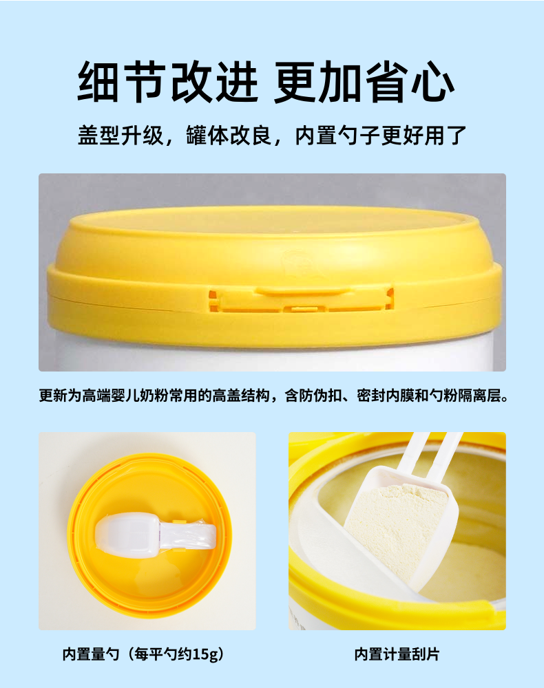 内置量勺由原本的12g升级为15g/每平勺,更方便计算食用量。