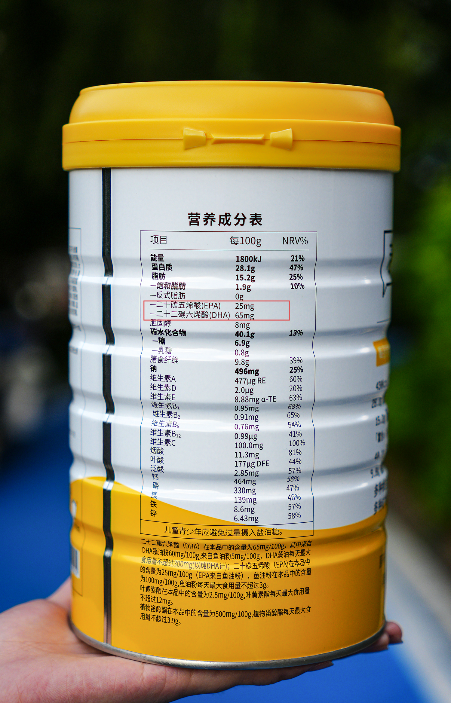 细心的朋友们可能会发现,在V2.15罐装包装的营养成分表中的「脂肪」这一项,我们增加了一块不饱和脂肪酸——DHA和EPA在每百克若饭中对应的含有量,并且符合『富含』标准。