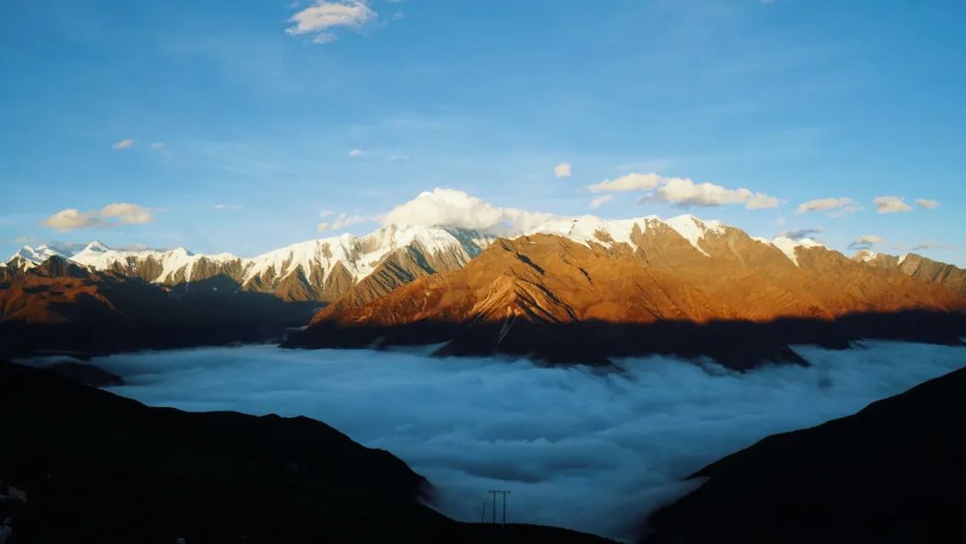 第三天早上4点我们出发子梅垭口看日出。车子直接开到山顶,但一路上都是碎石烂路,颠得够呛。子梅垭口距离贡嘎直线距离仅有5公里,是川西网红级别的观景台,天气好的话,可以看到云海和贡嘎主峰巍峨的山势,比如这样: