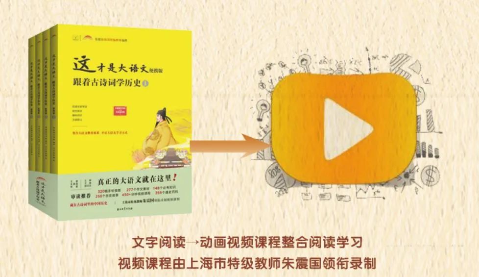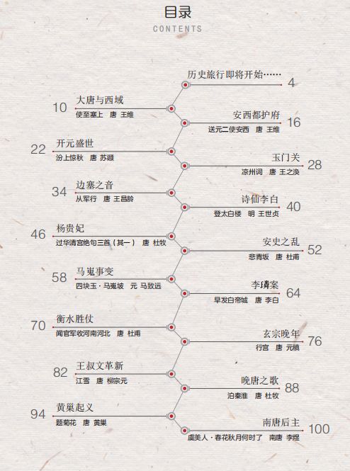 整套书全都采取这种“以诗为点—进入历史—走进作者—纵观全局”这种逻辑结构,每一首诗词每一个历史节点为一章节,以古诗词为切入口,从诗词的“点”逐步讲到历史的“面”,以点到面,形成一个完整的历史发展脉络。