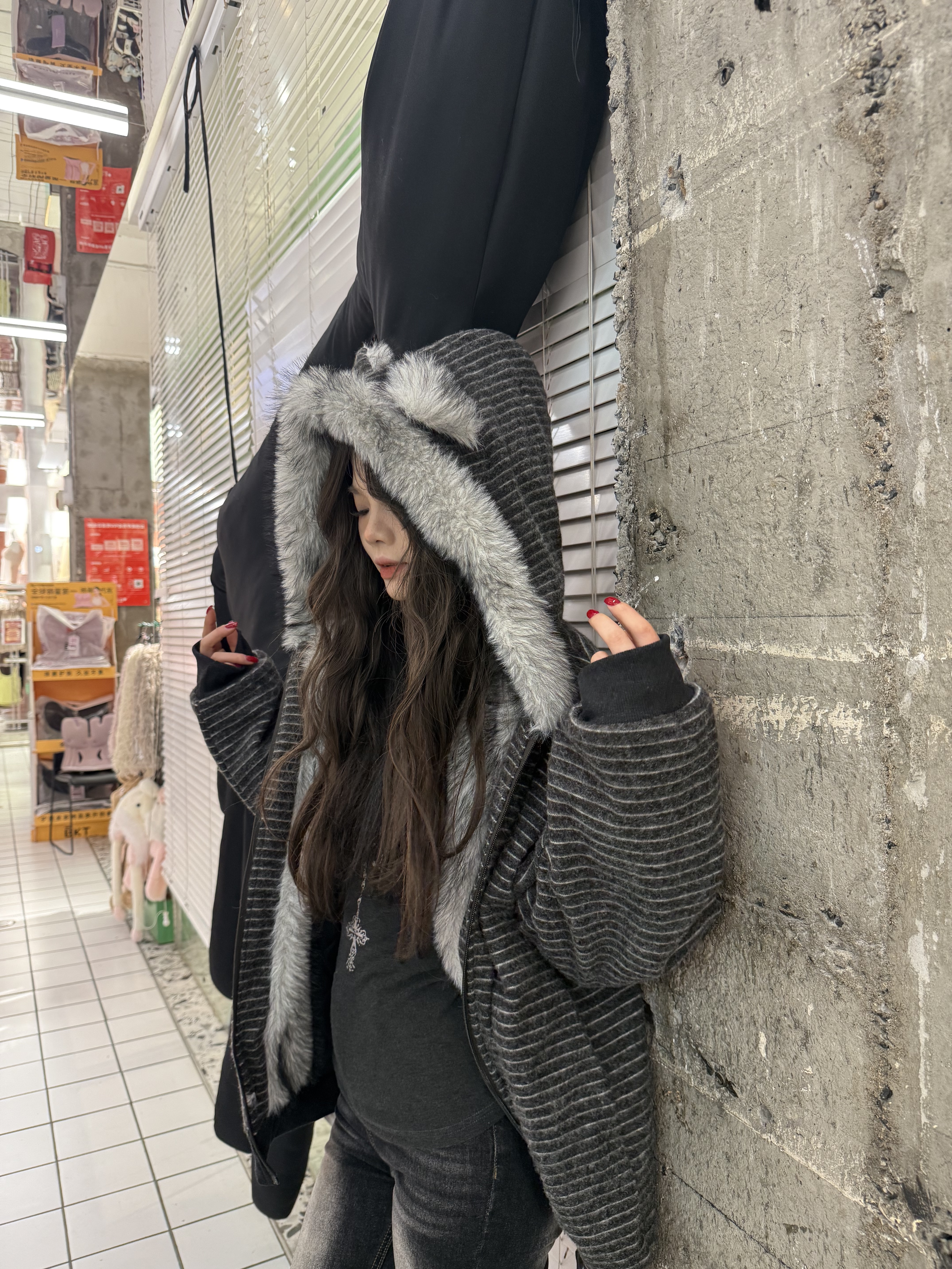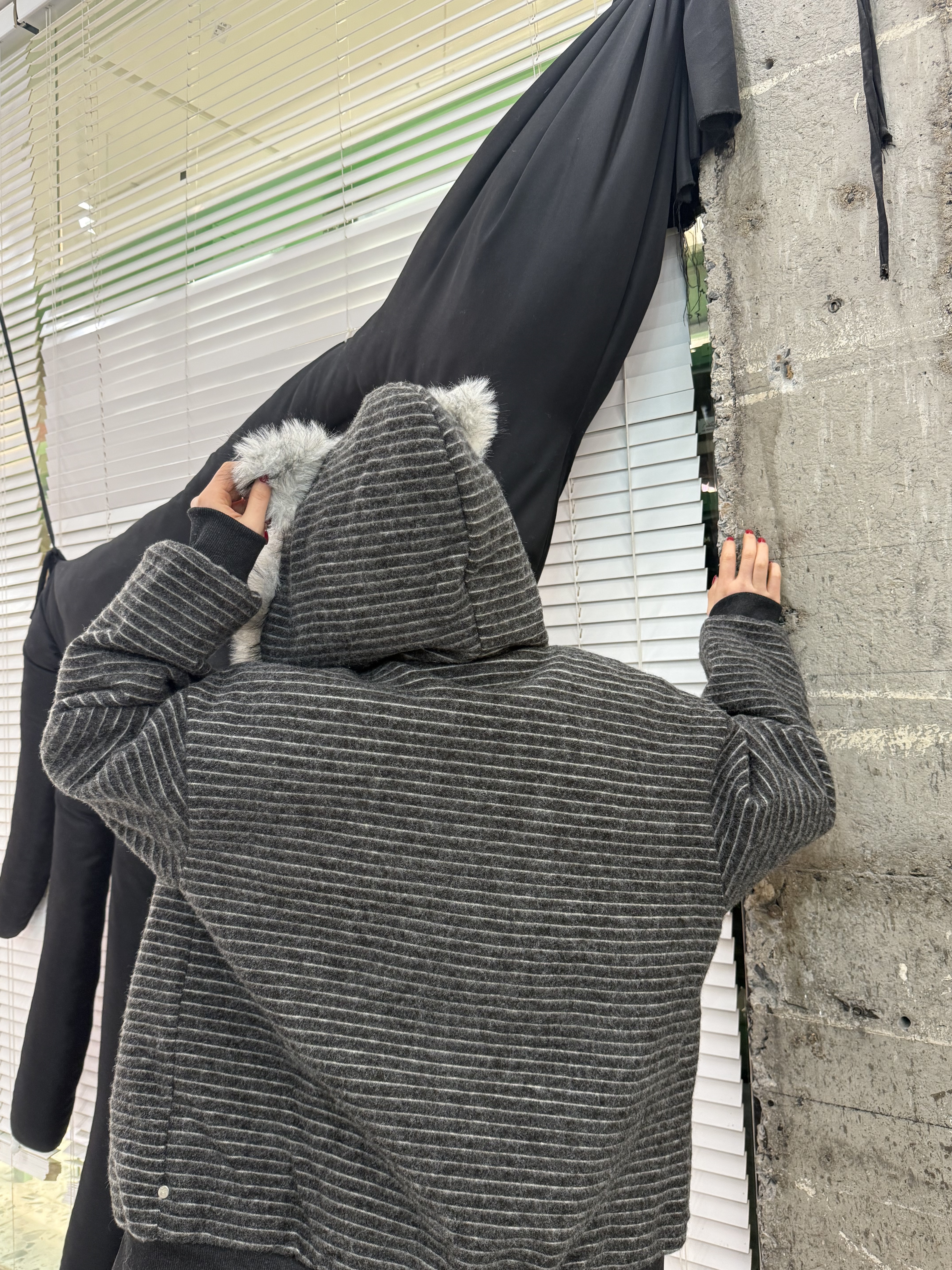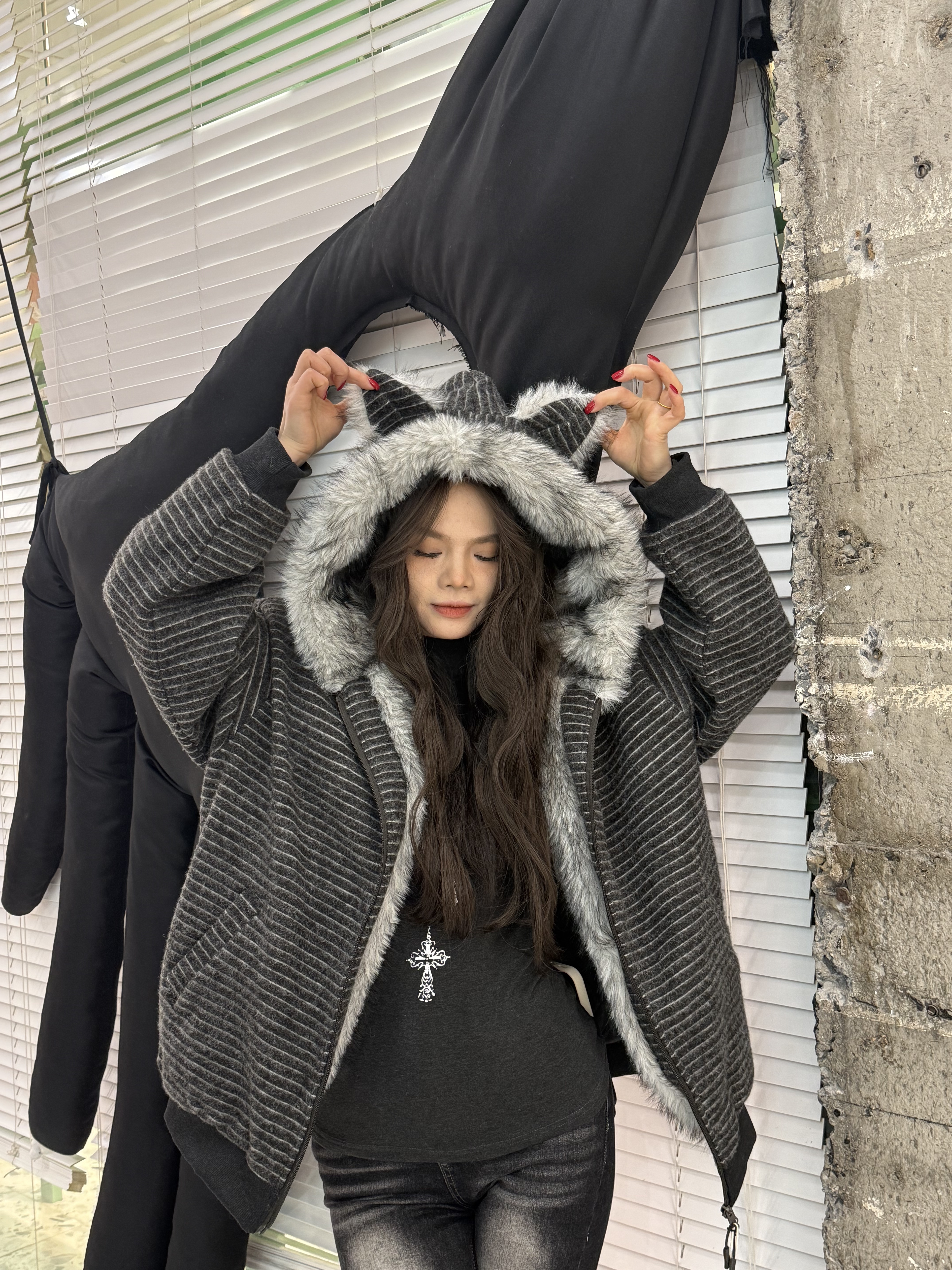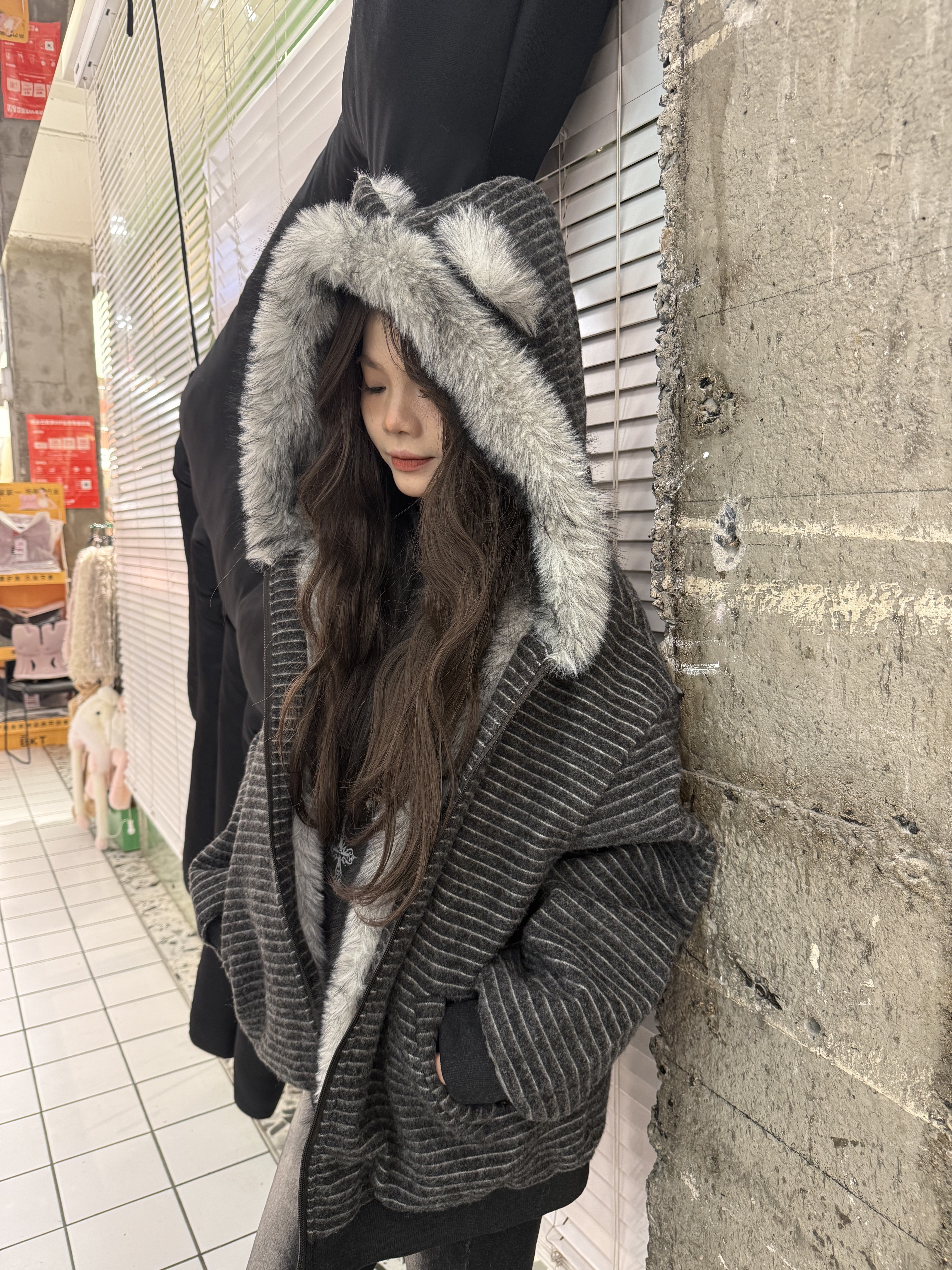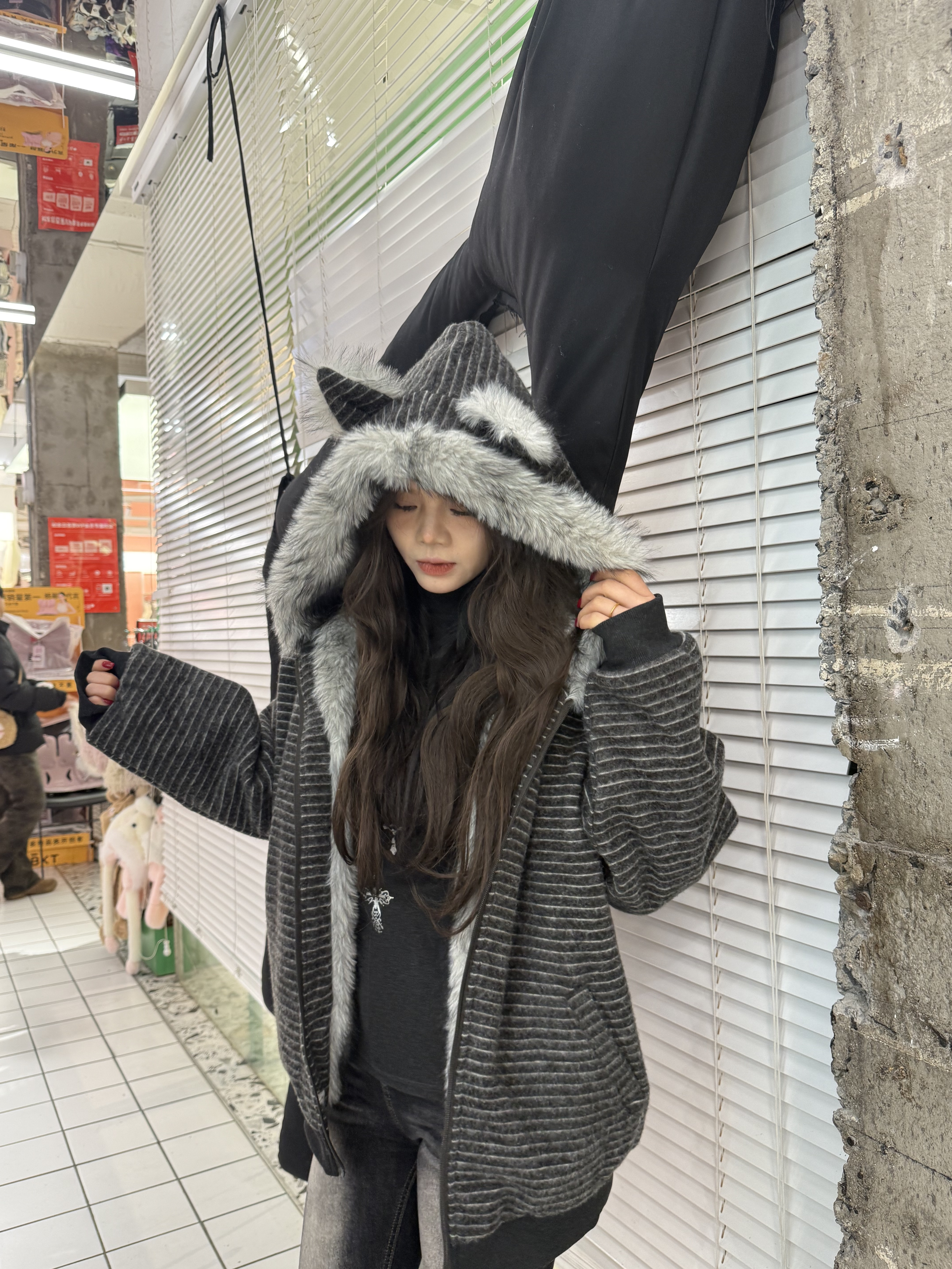 荒诞毛绒耳朵连条纹保暖外套