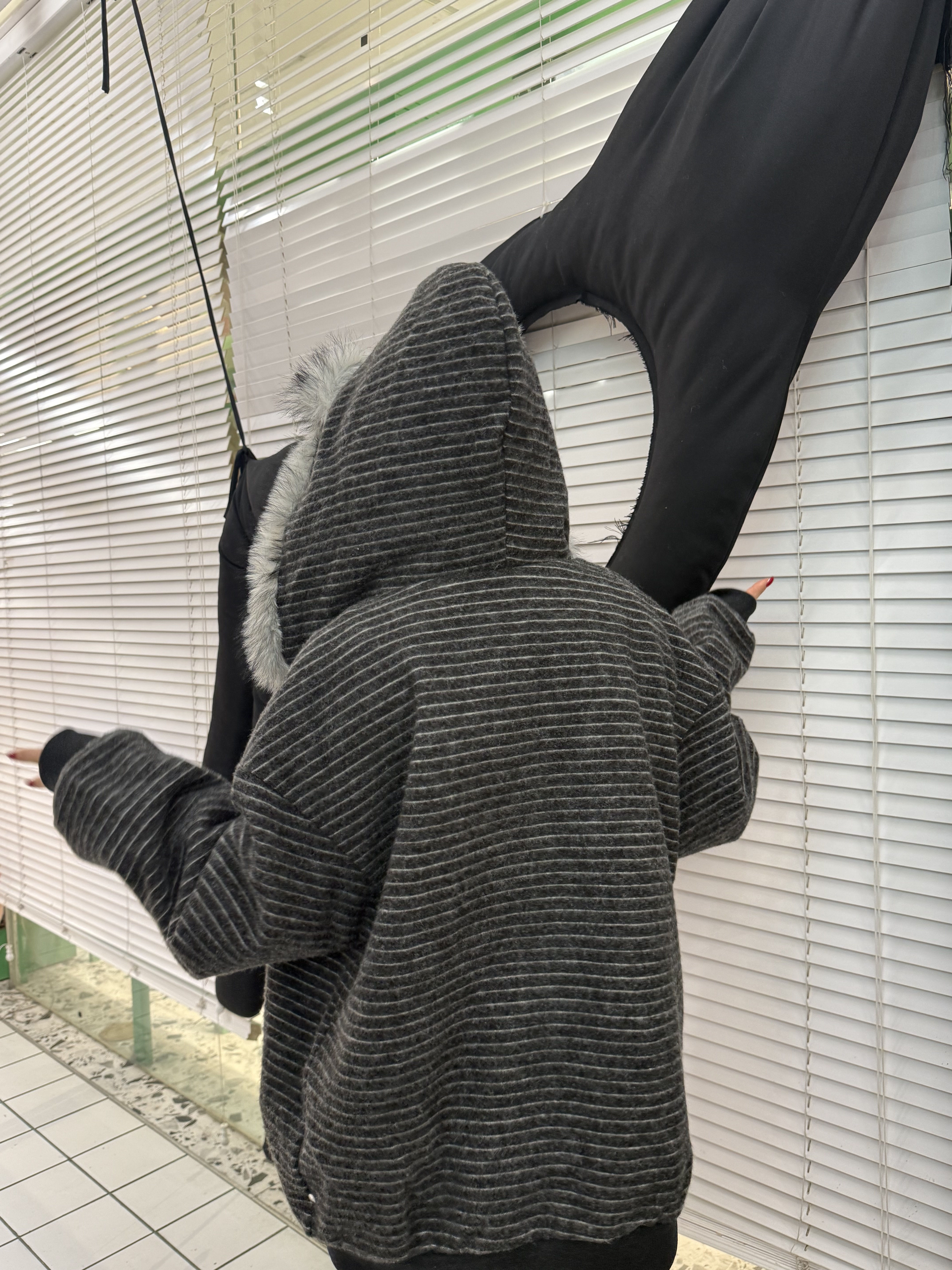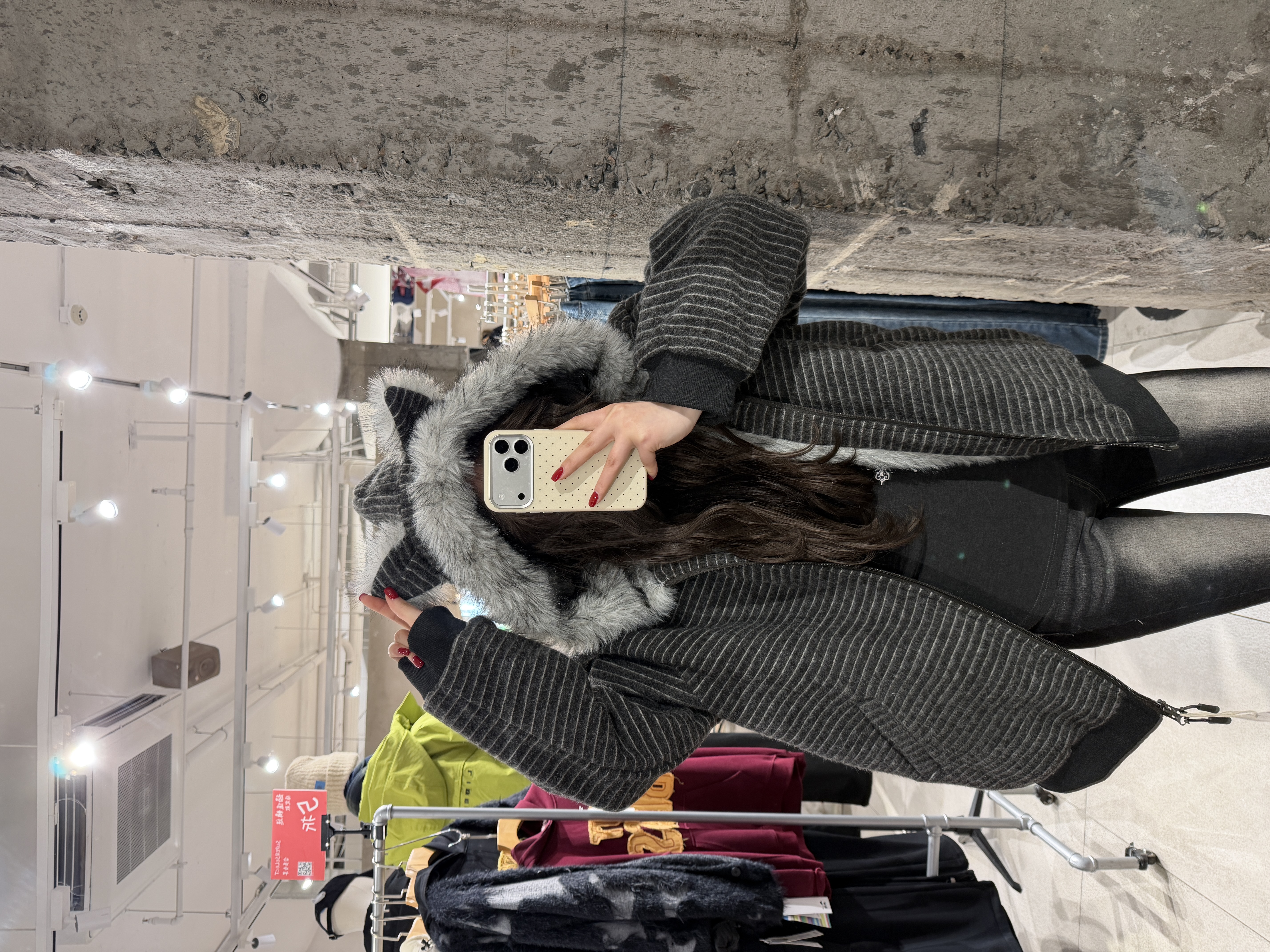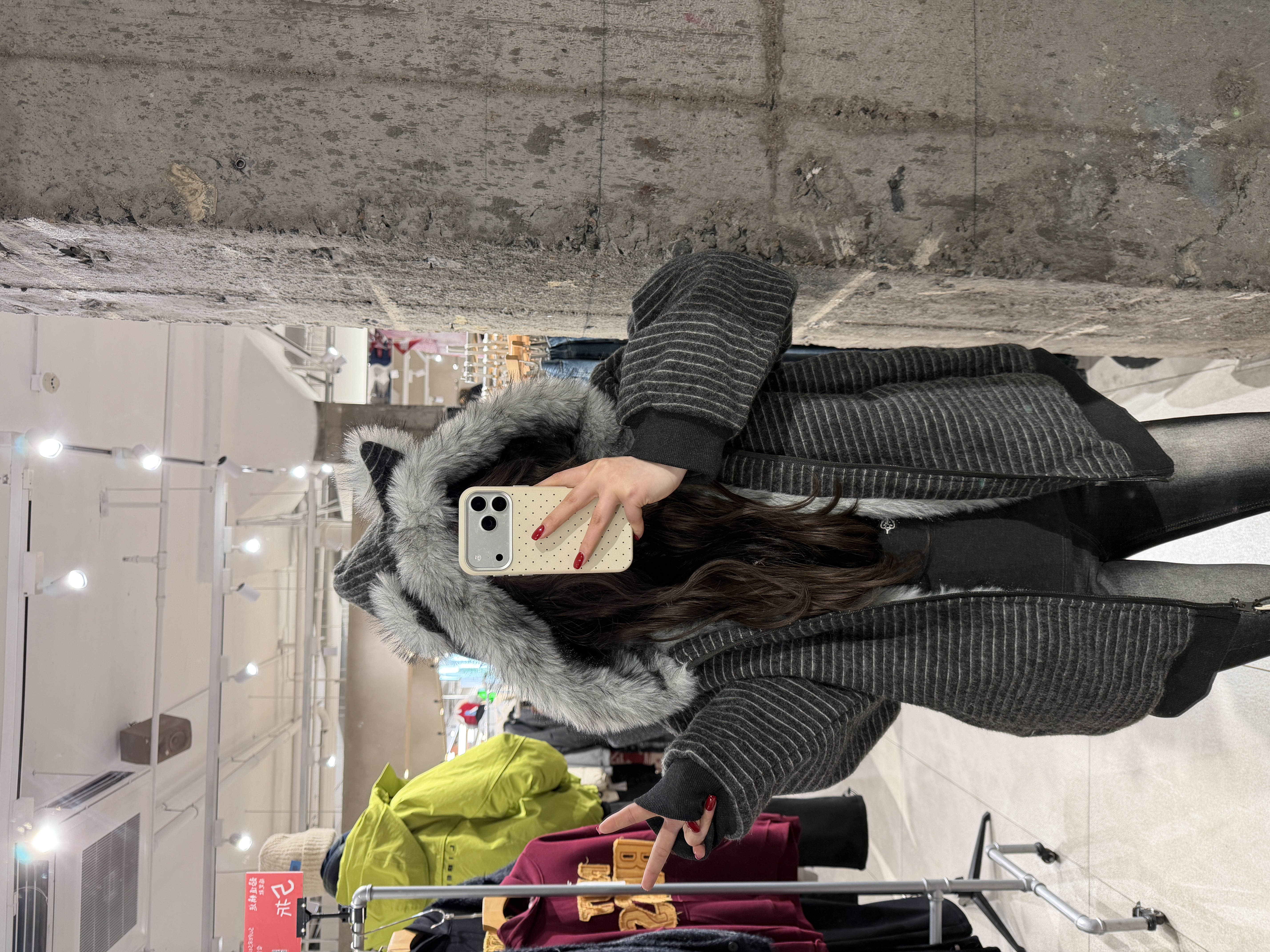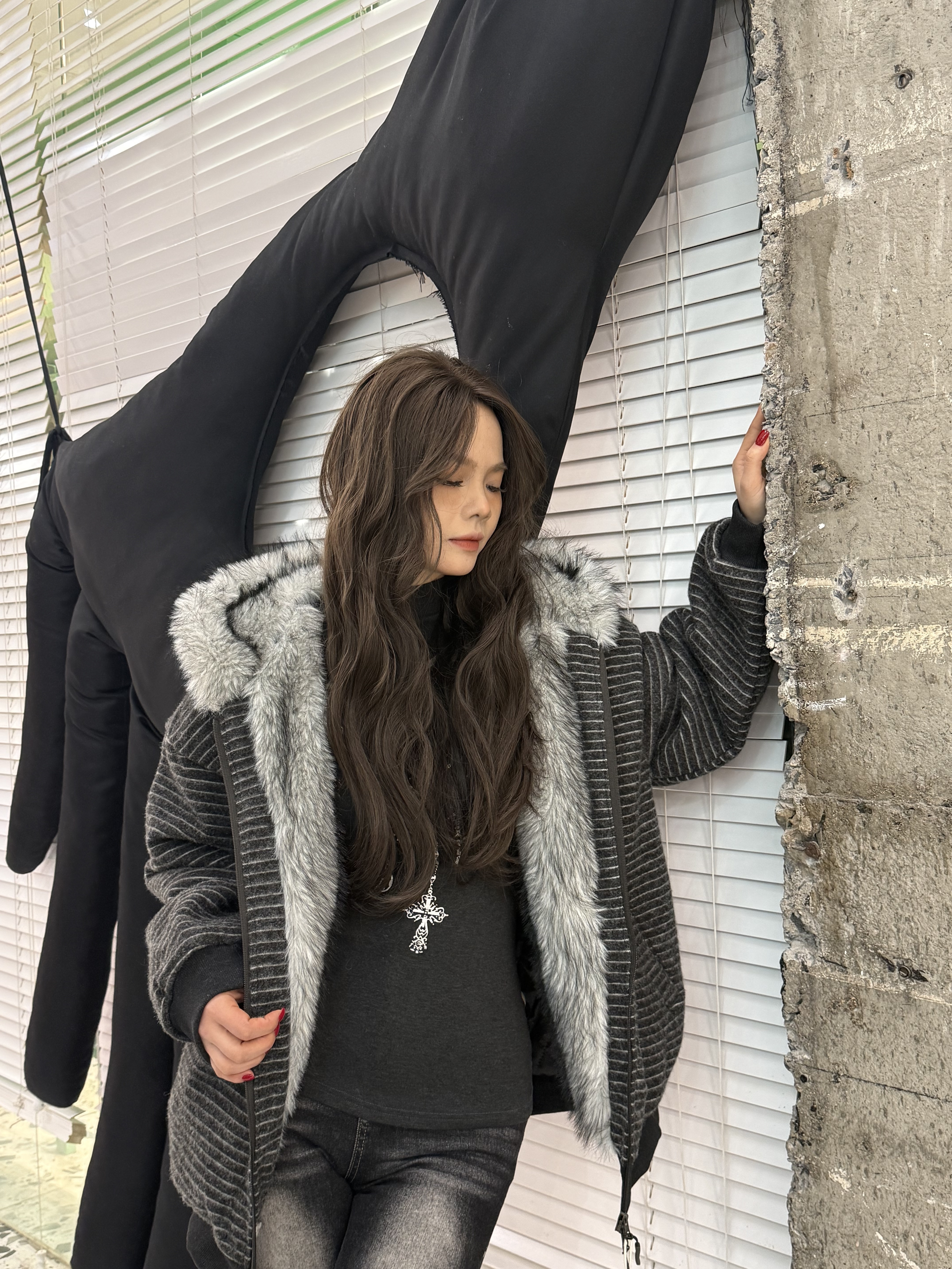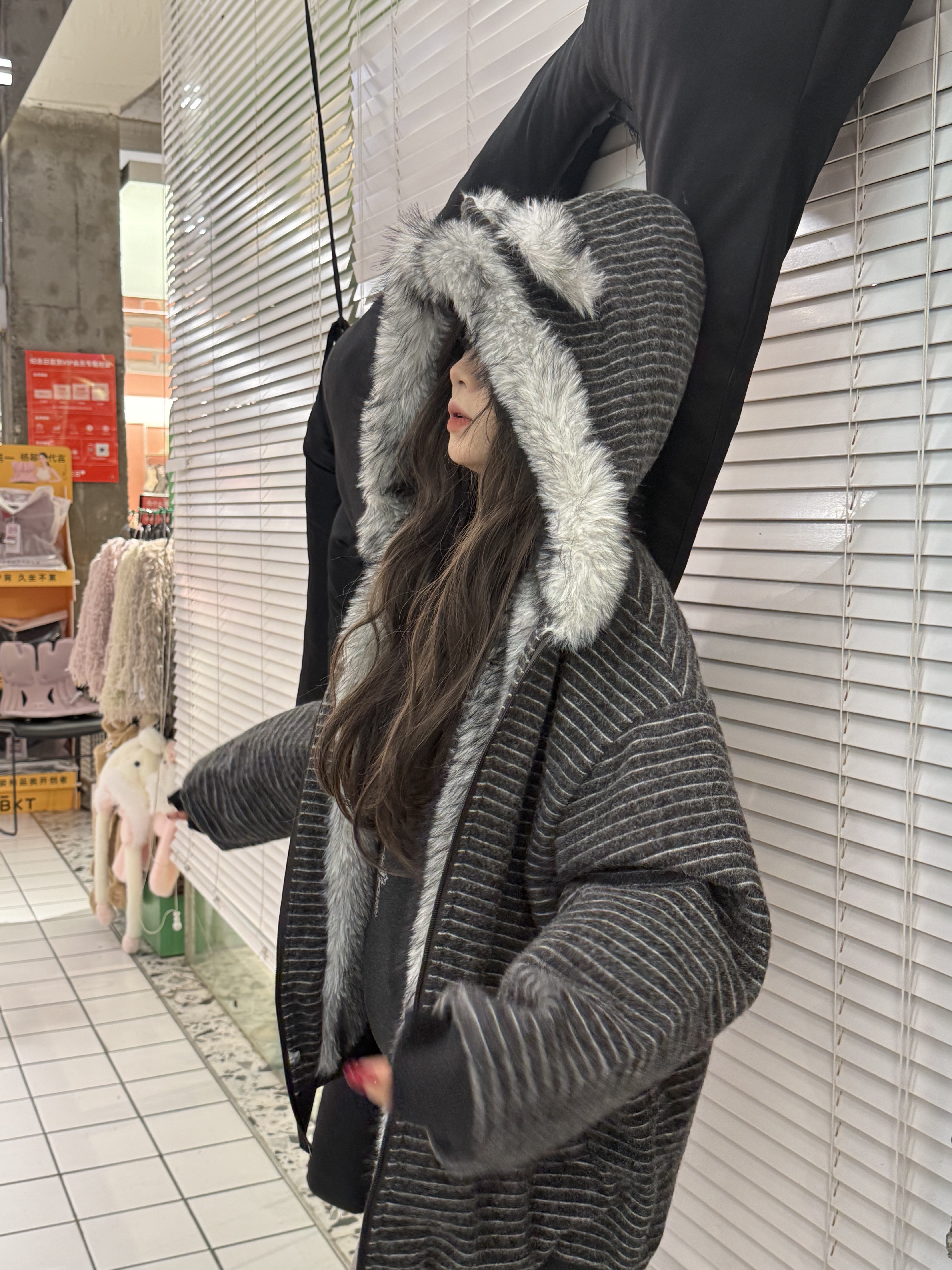 荒诞毛绒耳朵连条纹保暖外套