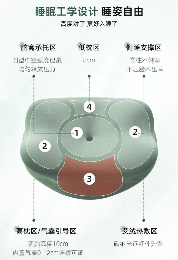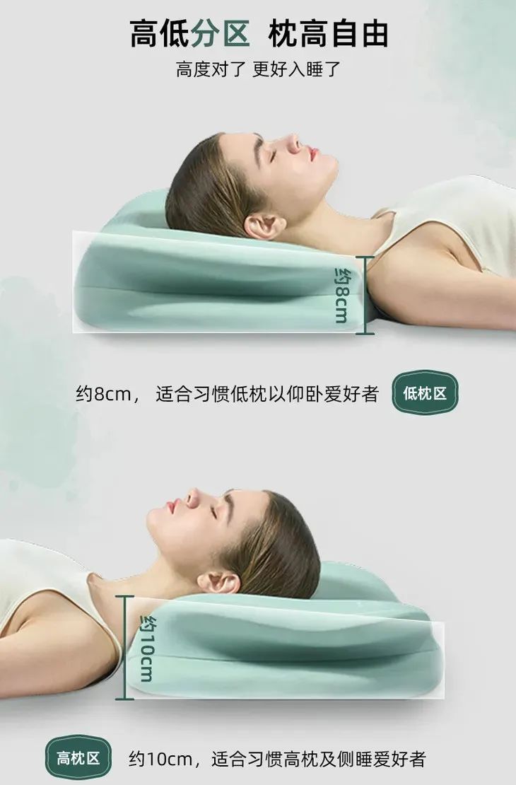 2、高低分区,枕高自由,内置颈部动态气囊牵引,脖子一下子放松了!