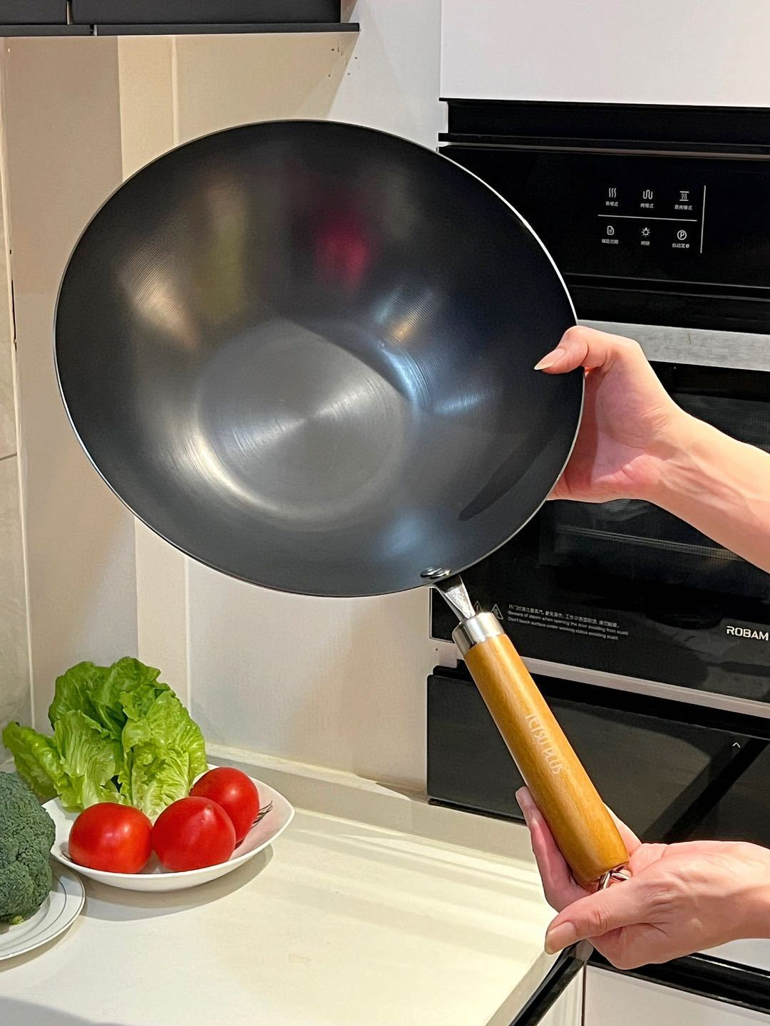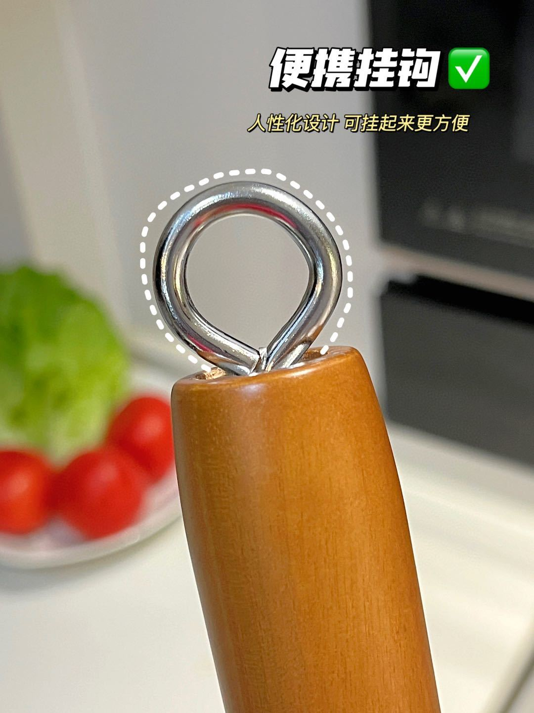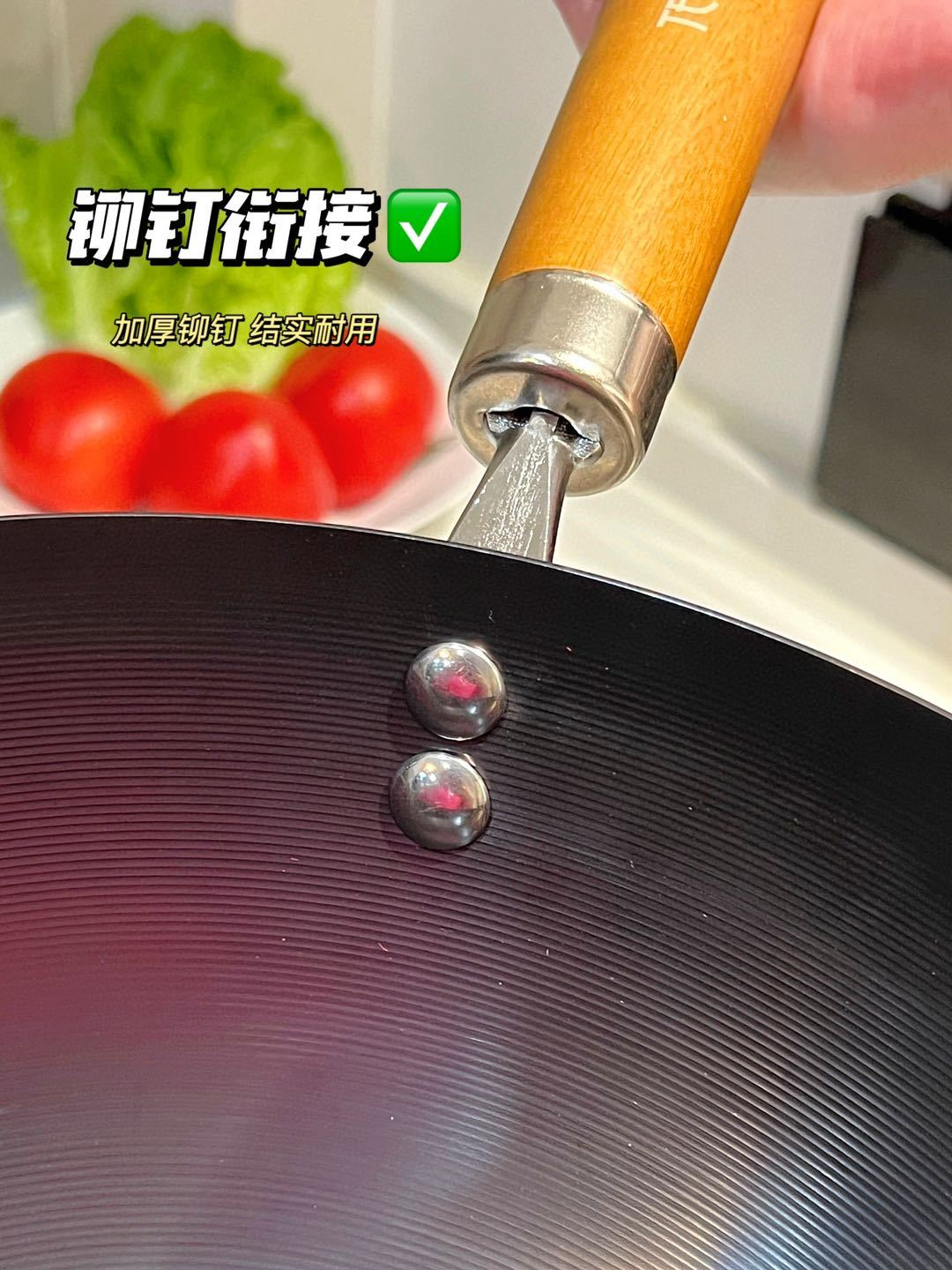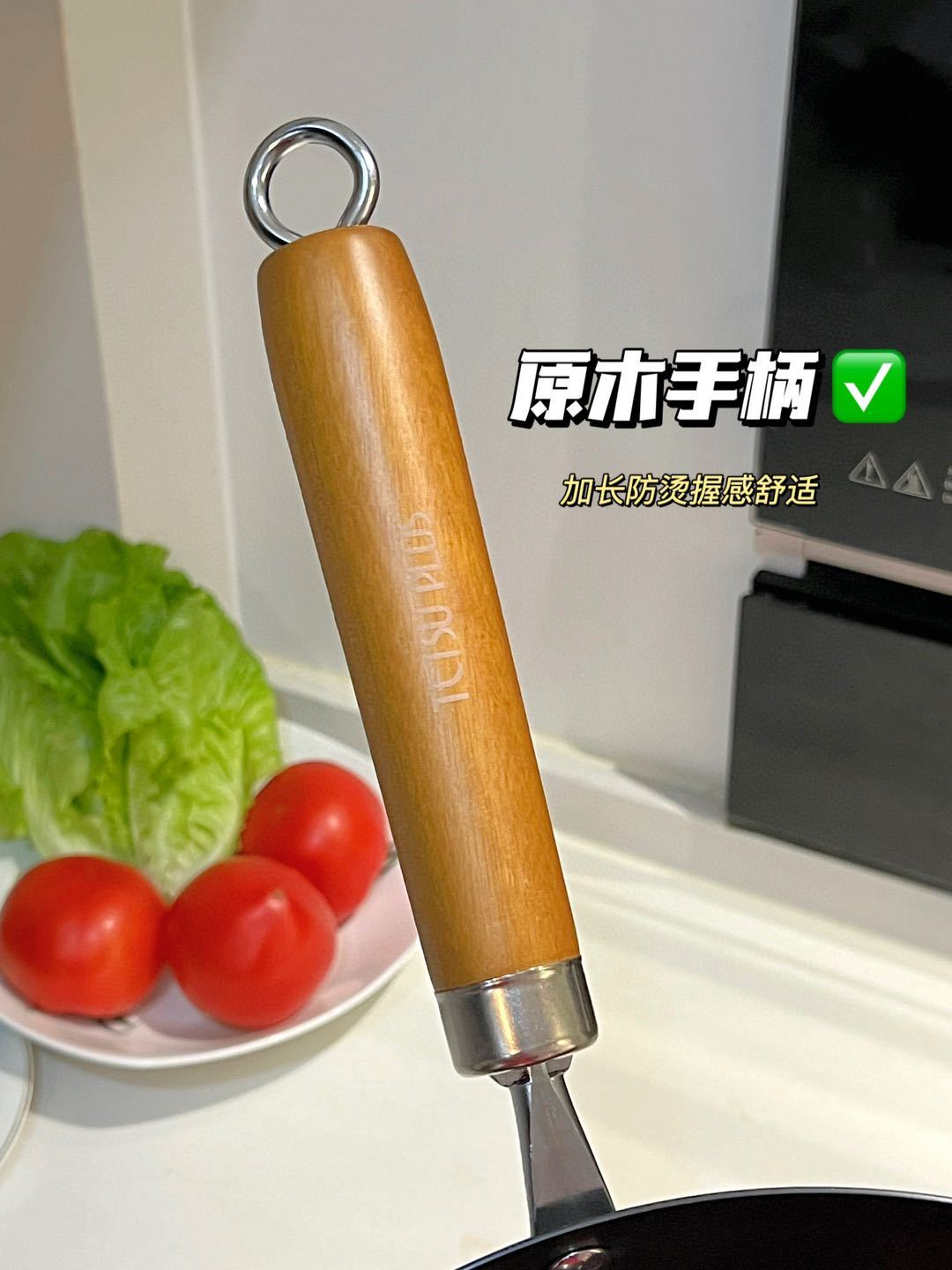 加厚原木手柄,隔热防烫,延长手柄掌勺更省力,不用担心炒菜途中突然脱落。