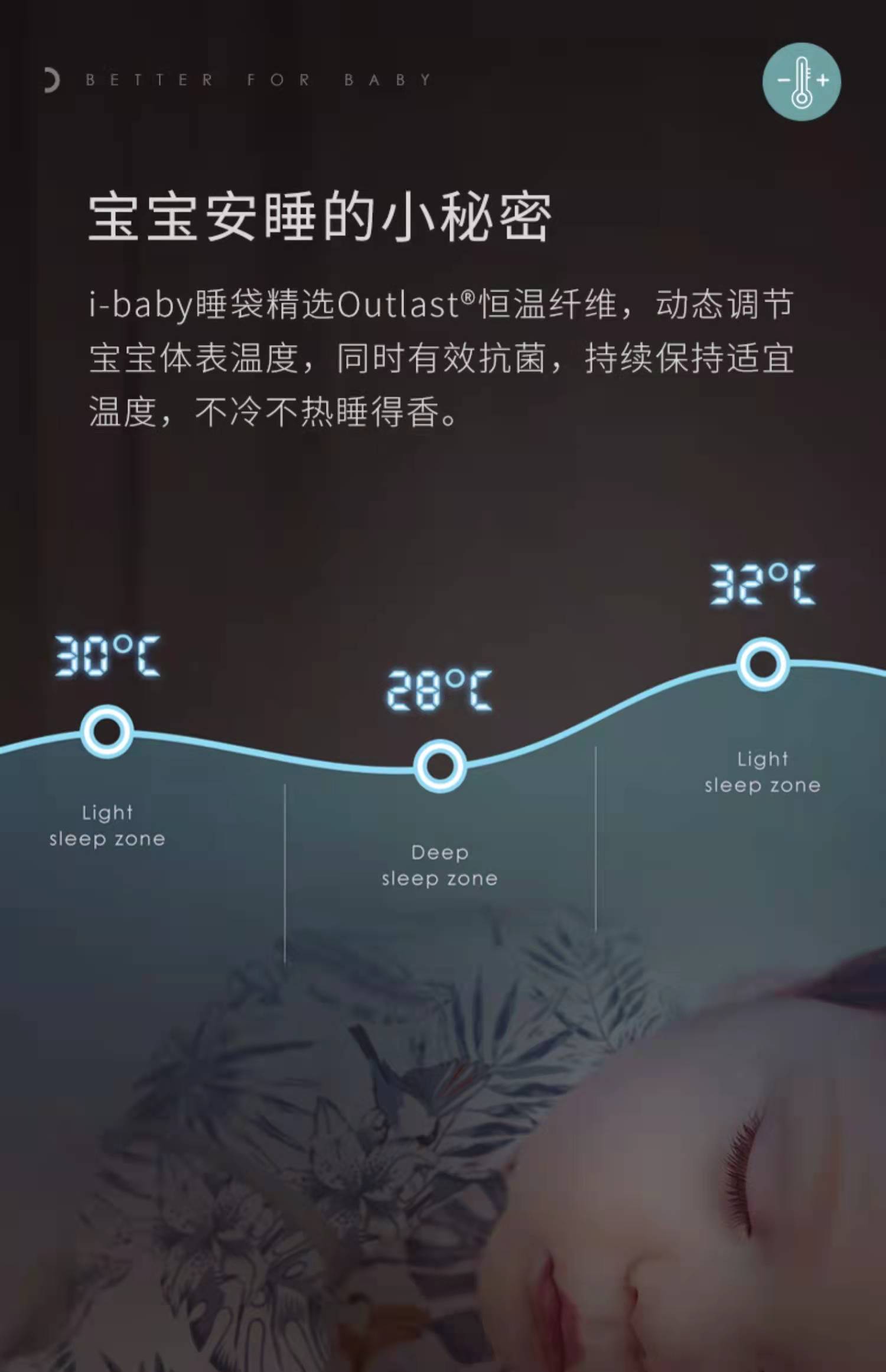 i-baby恒温睡袋的面料采用制作航天服的顶级Outlast纤维技术,自动吸热放热,智能调节宝宝体表温度!能让睡梦中的宝宝始终处于舒适的温度,不冷不热,睡得更香。