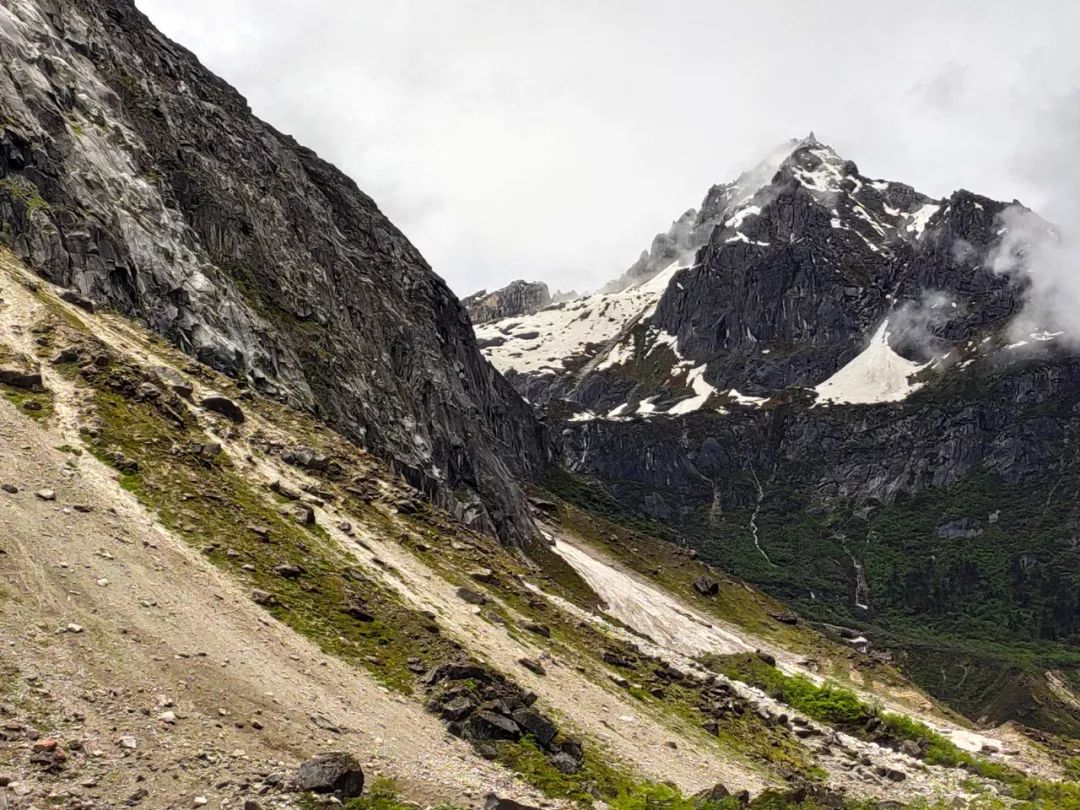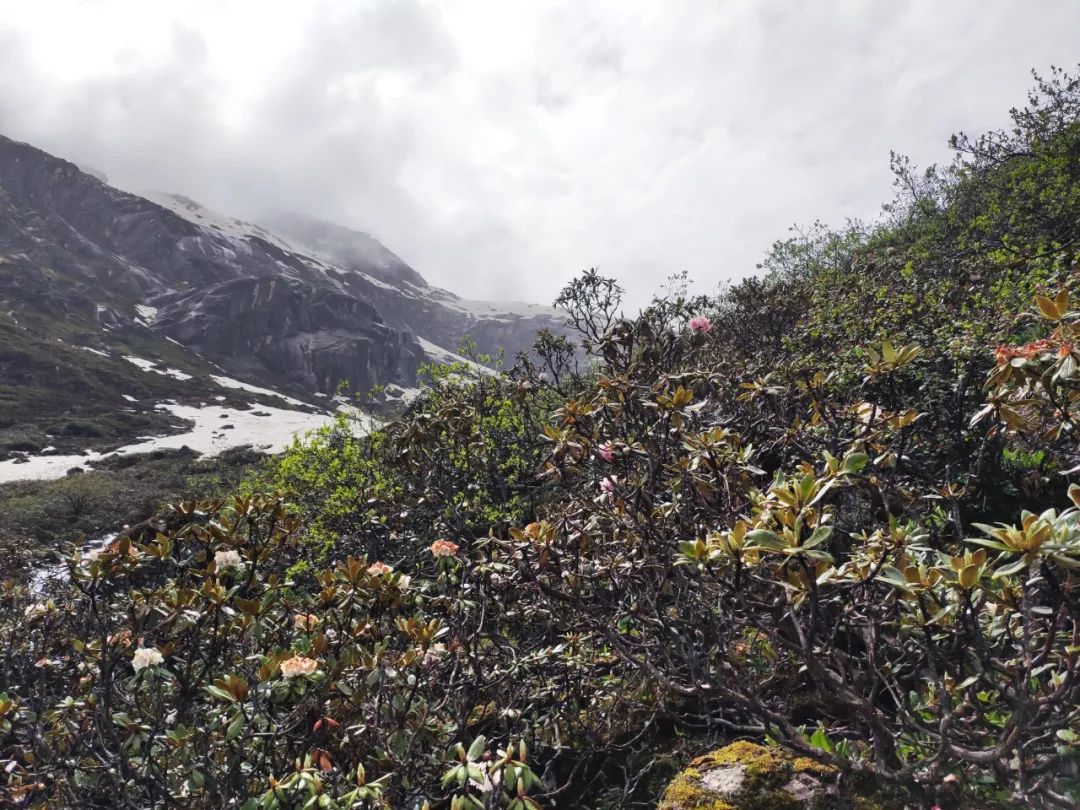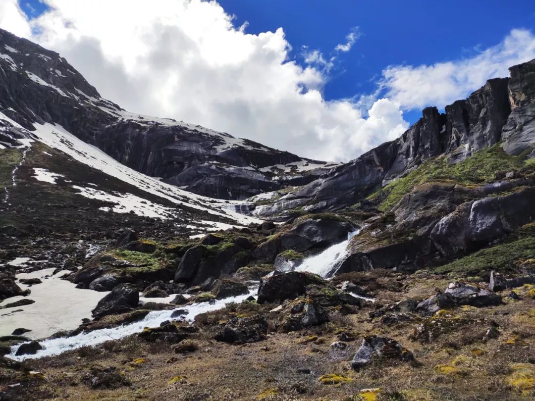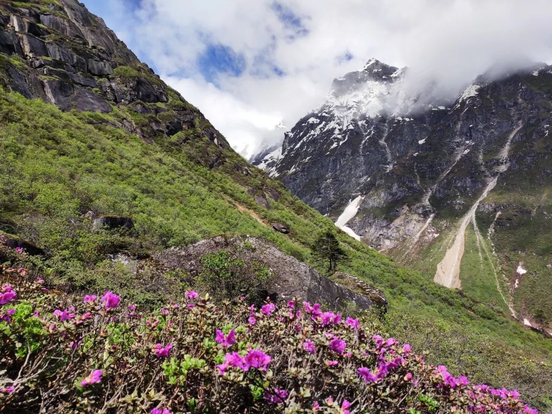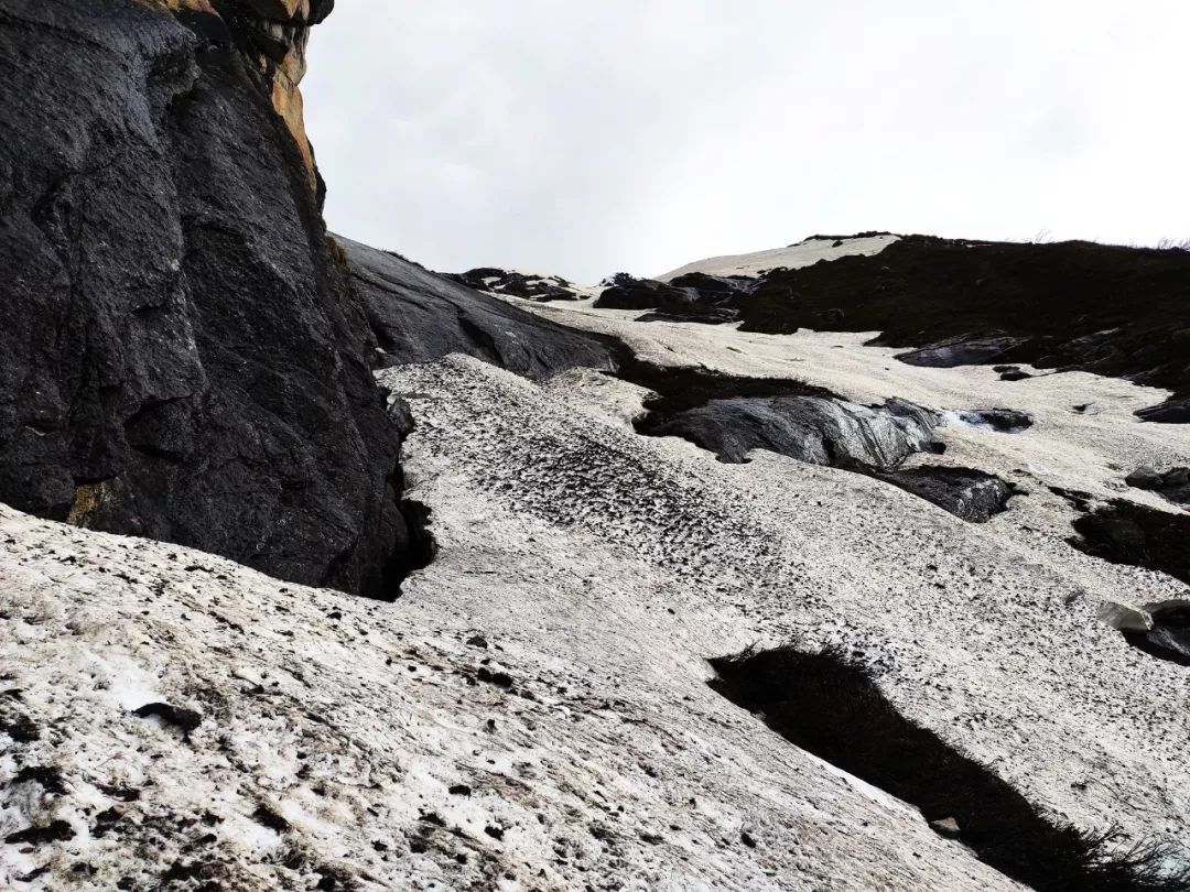 走过这片花海,望向山谷尽头,出现在我眼前的是披着一层薄雪的陡峭湿滑的岩壁。它如同一堵巨大的墙挡住了希望,隔绝了生死。
