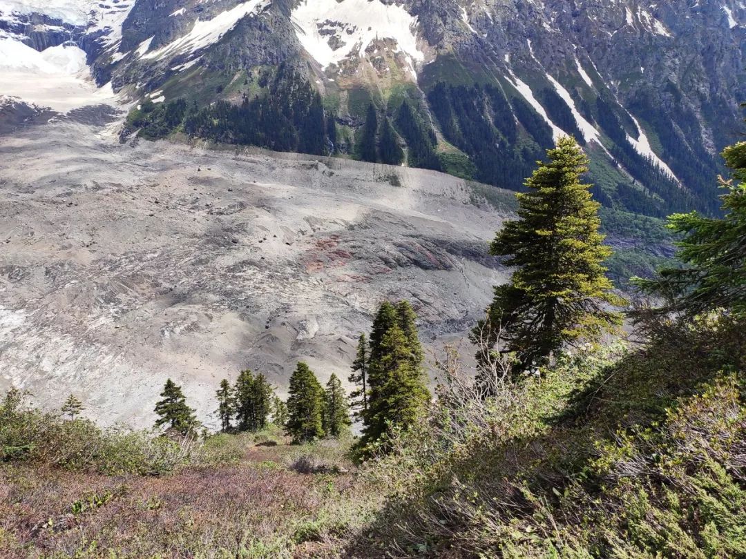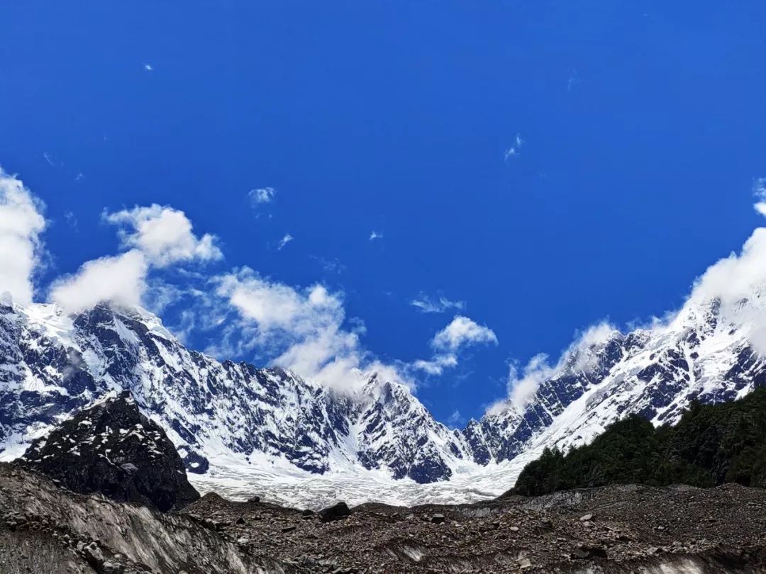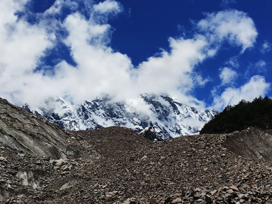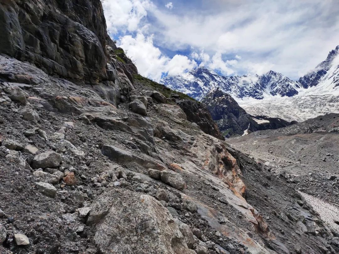 我很兴奋,很想离它更近一些,我和雪山中间相隔的是一大片冰川,幸运的是冰川上面铺满了小碎石,可以踩踏。我观察了一会儿这冰川,还是有些担心它的稳定性。另外如果沿着冰川走,不可避免的要经过一段瀑布,这样全身都会被淋湿的。就在这时,我突然发现左前方似乎可以沿着巨石横切到半山腰。切到半山腰后就应该是沙土路了,相对好走一些。