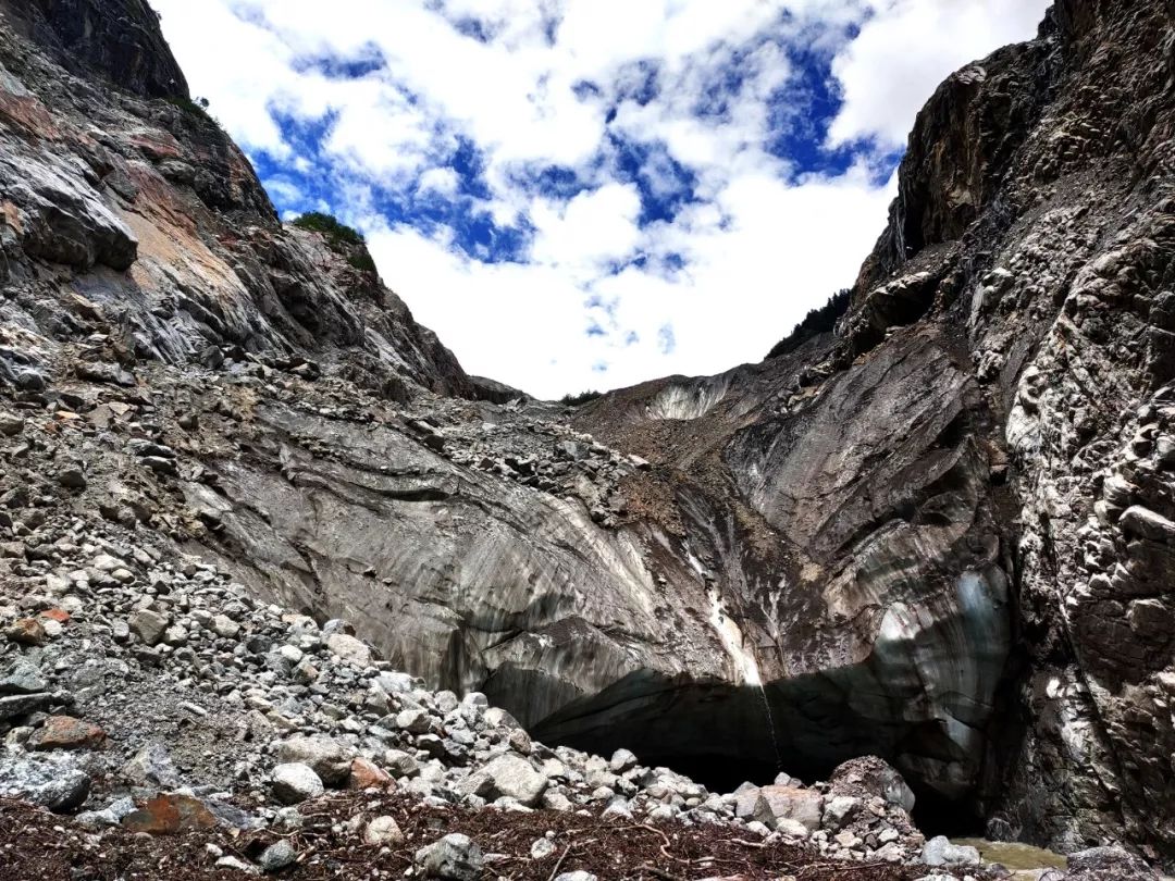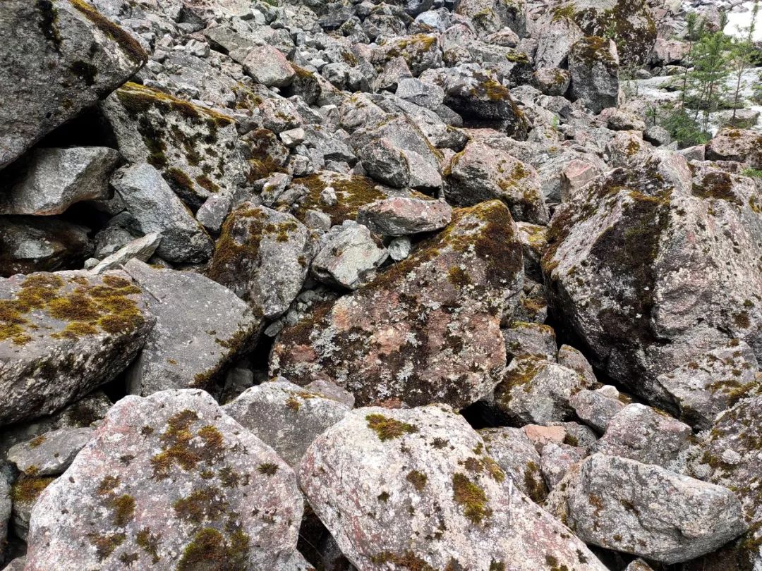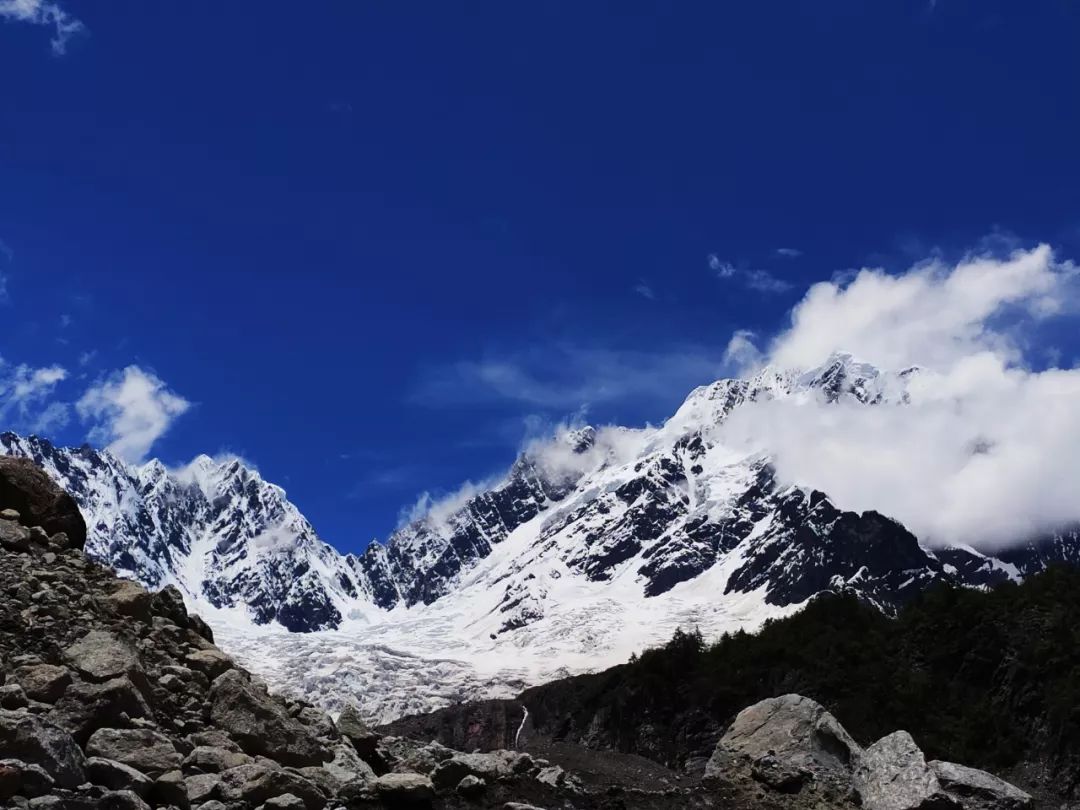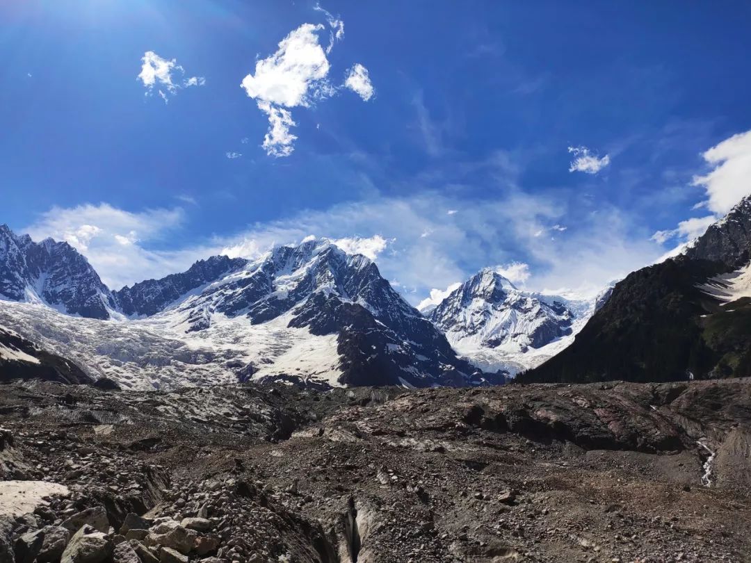 我很兴奋,很想离它更近一些,我和雪山中间相隔的是一大片冰川,幸运的是冰川上面铺满了小碎石,可以踩踏。我观察了一会儿这冰川,还是有些担心它的稳定性。另外如果沿着冰川走,不可避免的要经过一段瀑布,这样全身都会被淋湿的。就在这时,我突然发现左前方似乎可以沿着巨石横切到半山腰。切到半山腰后就应该是沙土路了,相对好走一些。