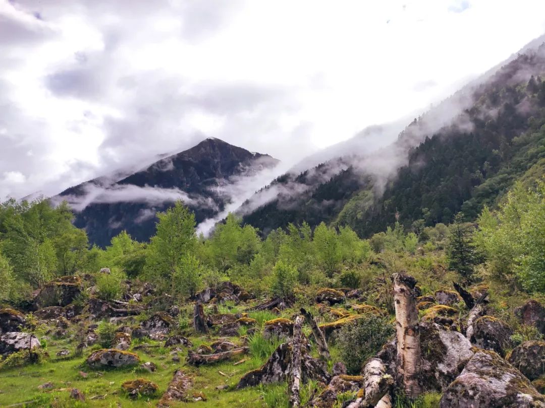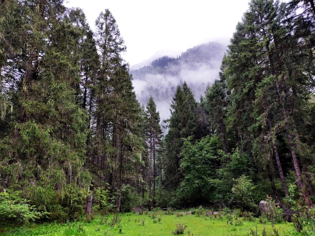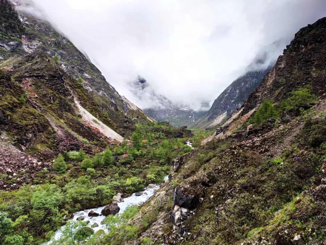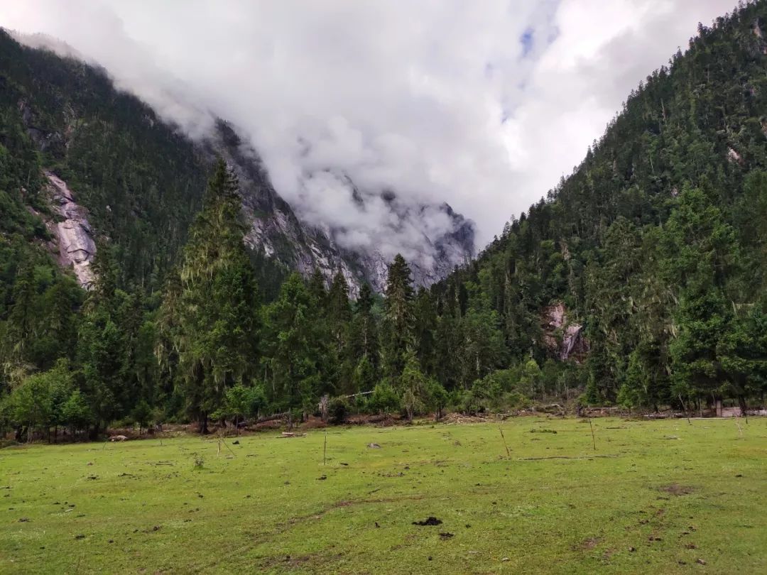 本来想早点出发的,但是雨一直下到九点多才停止。雨停后赶紧拔营。藏东南的路线雨季就是这样,每天早上和傍晚肯定要下雨的。雨后整个山谷云雾缭绕,如同害羞的少女,始终蒙着一层面纱。