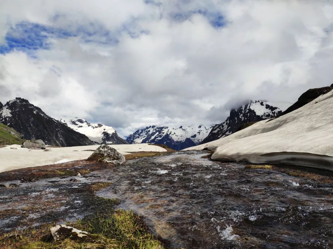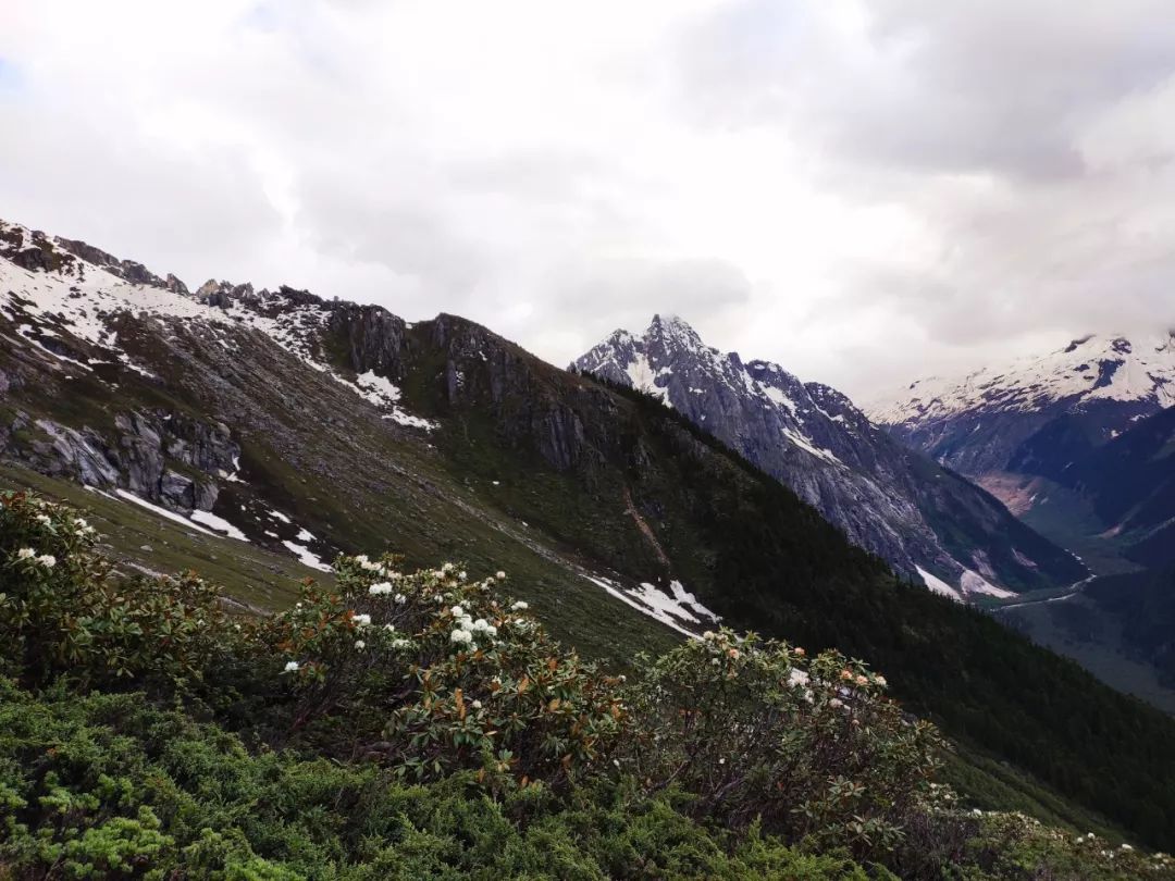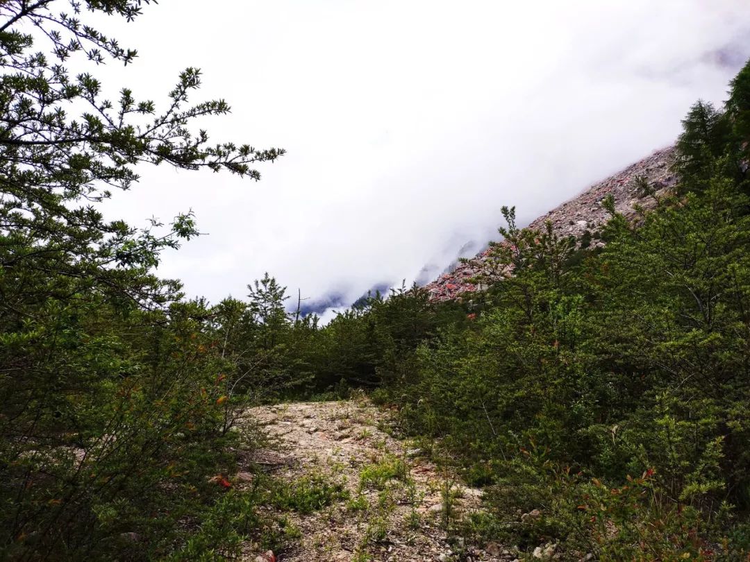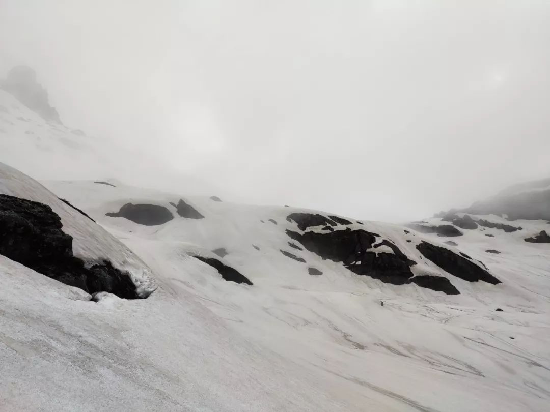 突然间一阵妖风袭来,垭口方向瞬间乌云密布,我的心也蒙上了一层灰暗,担心起来。因为这个垭口是此行的一个难点,翻过垭口后下降的坡度很陡,如果到了垭口顶,看不清方向会很危险的。