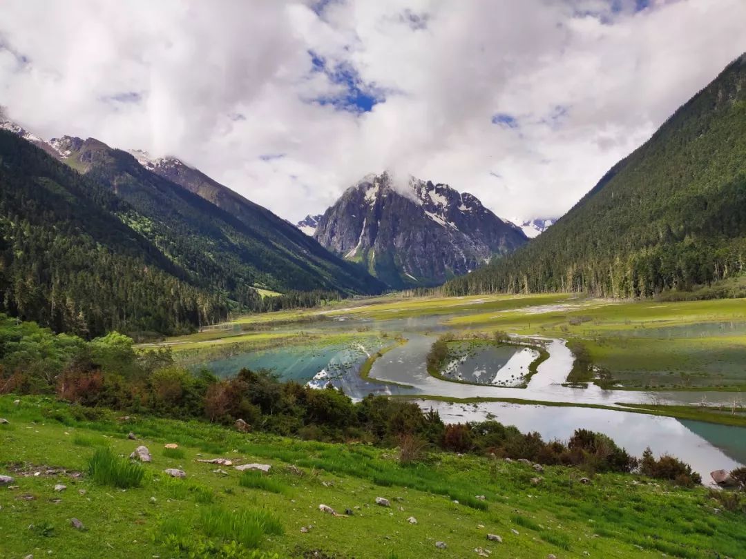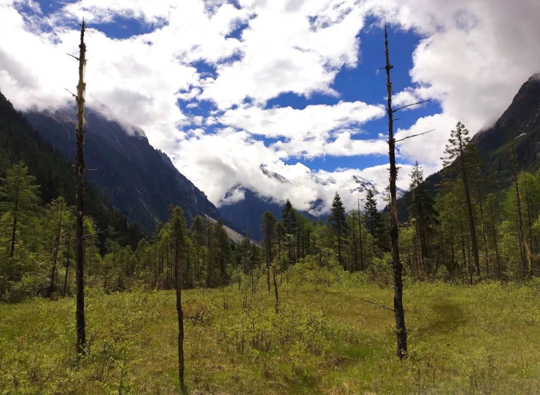 欣赏完这雪山美景我就拔营出发了。本以为今天的这个河谷会很好走,可是刚出发没多久就发现到处都是沼泽,最后我心一横,干脆淌水算了。这个河谷的名字叫错布隆巴河谷,我今天将沿着错布隆巴的右岸顺流而下。在沼泽里淌水几百米后,竟然发现河谷东边的树林里隐隐约约有一些路迹,当时真是后悔莫及。不过也没办法了,鞋子既然已经湿了,就只能硬着头皮在河谷东岸走了。