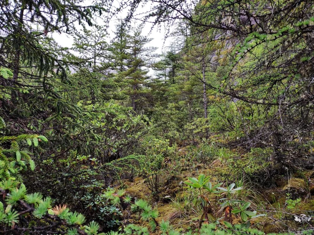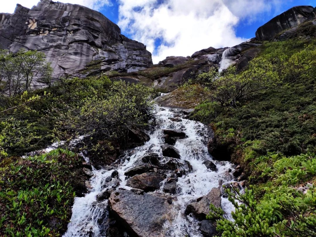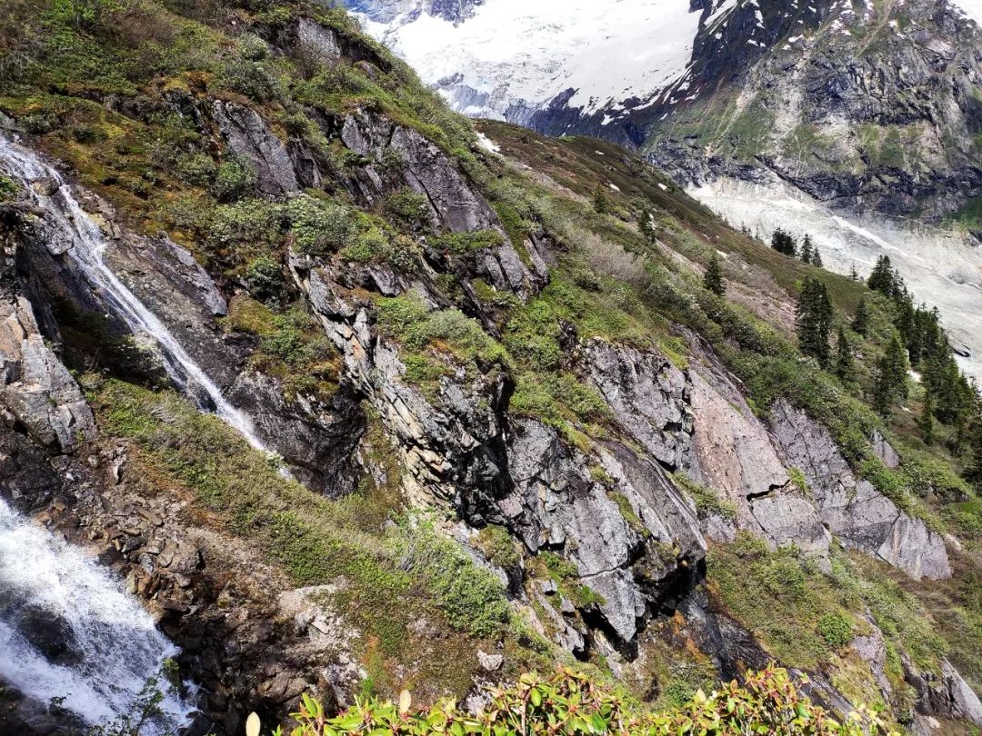 昨天上来时我在下面观察了下地形,找了一条自认为比较好走的上山路,可事实证明这条路并不好走,我遇到了很多比较危险的路段,尤其是那段风化的沙土陡坡。因此今天我想按照守队原设计的路线下降,下到雪线以下我就开始往西边横切。这横切的路有些艰难,几乎全是杜鹃林和低矮灌木丛,时不时的还会出现一条溪流瀑布,遇到溪流瀑布后,我或是向上或是向下,想找一处水流最窄的地方跨越过去。