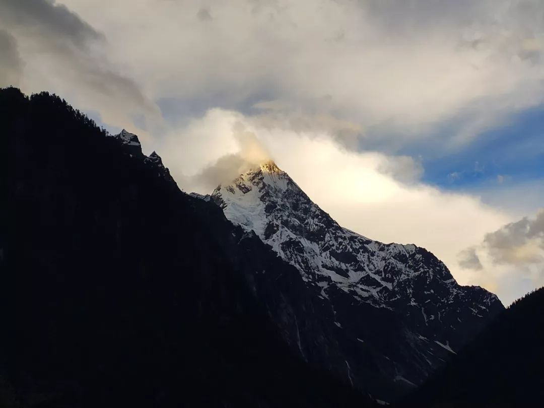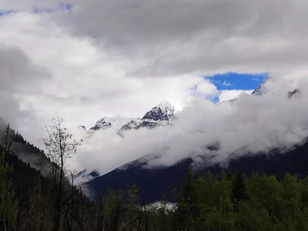 我背起背包准备下山。在觉姆垭口右侧的雪山这时也露出了山尖,似乎在为我送别。