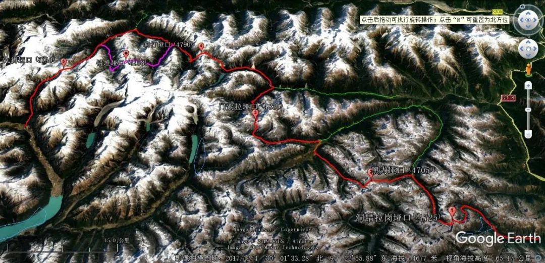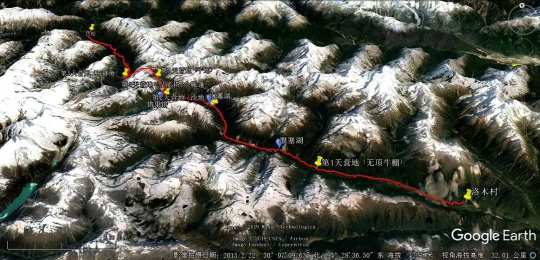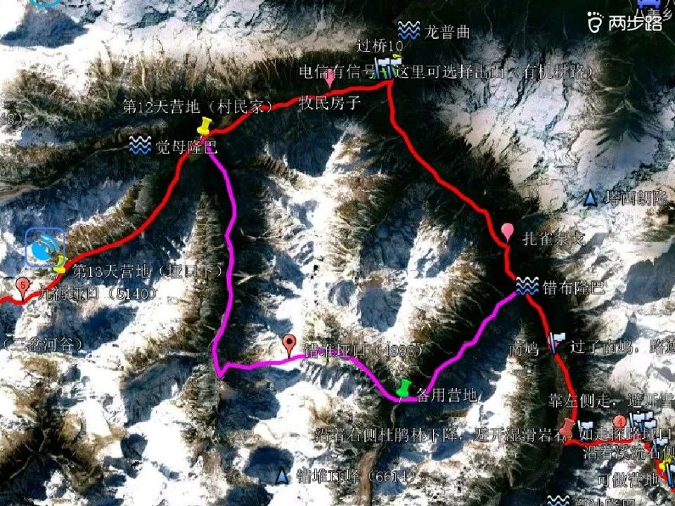 对于该完整版设计路线有一点要说明的是:为了不走吕松到龙普村这段机耕路,也为了让路线变了更原始,离开路线第 10 天的响打营地之后过错布隆巴曲这条大河到河的西岸,沿着河的西岸向北走,遇到河谷西岸第一个山谷后我增加了一条备用路线轨迹,沿着该轨迹走需要翻越一个陡峭的错堆垭口(海拔 4998)后到达龙普村。由于这个垭口靠近错堆雪山(海拔 6614),所以垭口肯定会有冰川,需要穿冰爪翻越。因此这个垭口也是个未知垭口,能否翻越过去还是未知数。