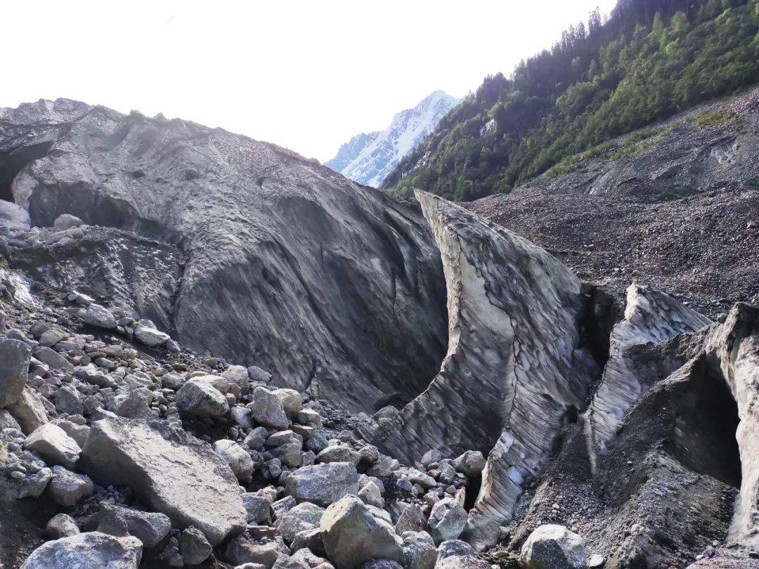 我终究还是迈开了步伐,只不过这步伐很慢,速度就像攀岩选手一样。我走每一步之前都仔细考虑,因为一个判断失误就会让我坠崖。就这样艰难的横切了大概一个多小时,终于在下午四点多下到了河谷冰川上。