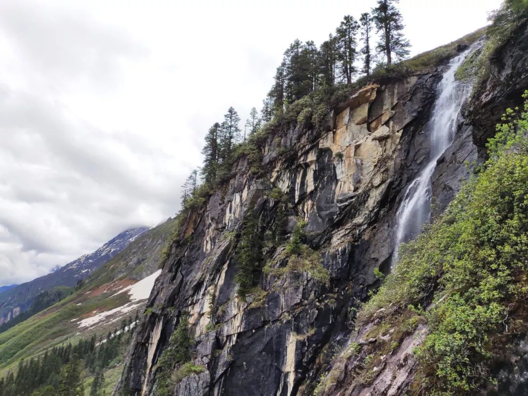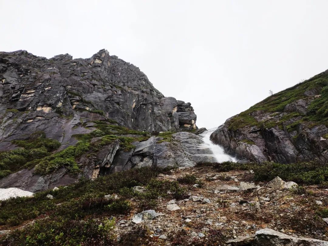 瀑布左右两边都是湿润的长岩壁,想要上去只能走瀑布的左边,那里有一些灌木可以用手抓或者用脚踩,但是具体能不能走目前还不好确定,得上去后才能判断。可是这时天气又变差了,看着被乌云笼罩的雪山,我对接下来将要行走的路有些茫然。