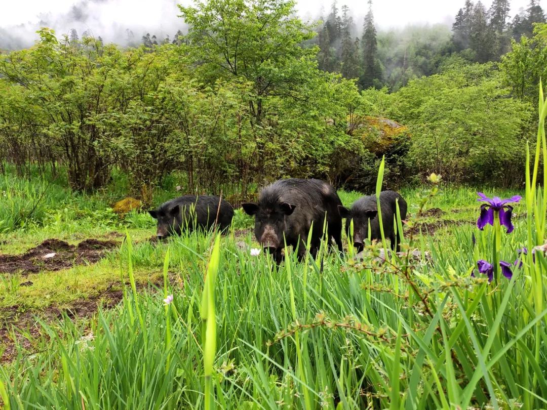 继续向前走,遇到了几头牦牛还有一群藏乡猪。这里的牦牛和猪也真是挺幸福的,他们整日自由自在的在山间乱跑。藏乡猪似乎并不怕生人,它们摇摇晃晃的靠近了我,很是可爱。但是当它们距离我还有几米的时候,突然一声吼叫,转瞬间就跑到了林子里去了。我很是纳闷,究竟发生了什么?