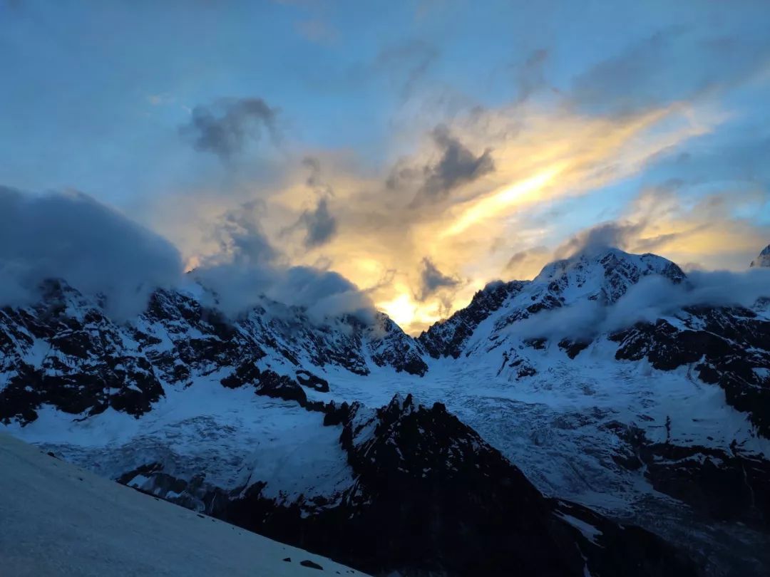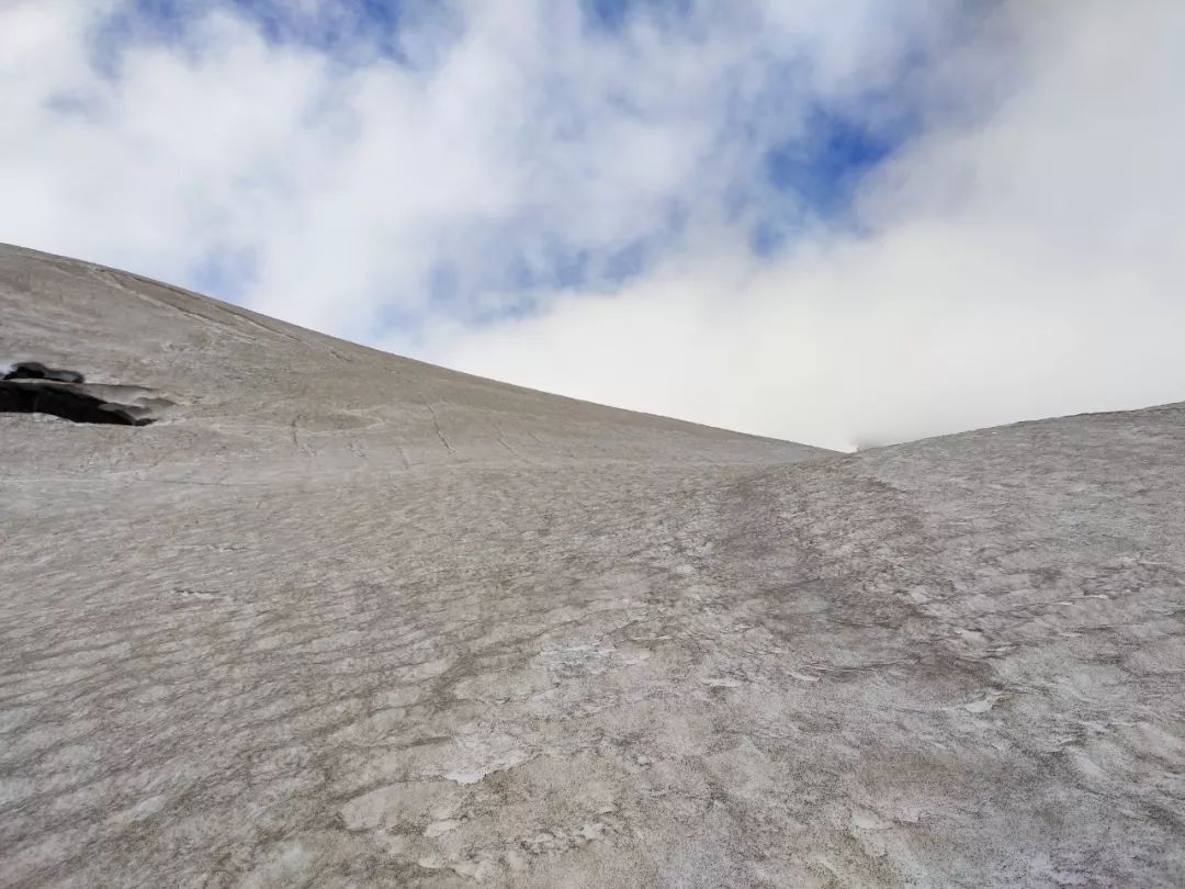 冷静半分钟后检查了身体,没有受伤,只是速干裤被划了个小口子,休息两分钟后继续赶路。这次我不敢再沿着这岩石向上爬了,而是改沿雪坡向右侧横切,切到了右侧灌木丛后才继续向上,不久爬到了真正的雪线。雪很松软,一脚下去能没到我的膝盖。虽然如此,至少比刚才走硬雪坡要安全的多了。我沿着这雪坡又爬了大概半小时,感觉应该扎营了,此时已经晚上7点了。