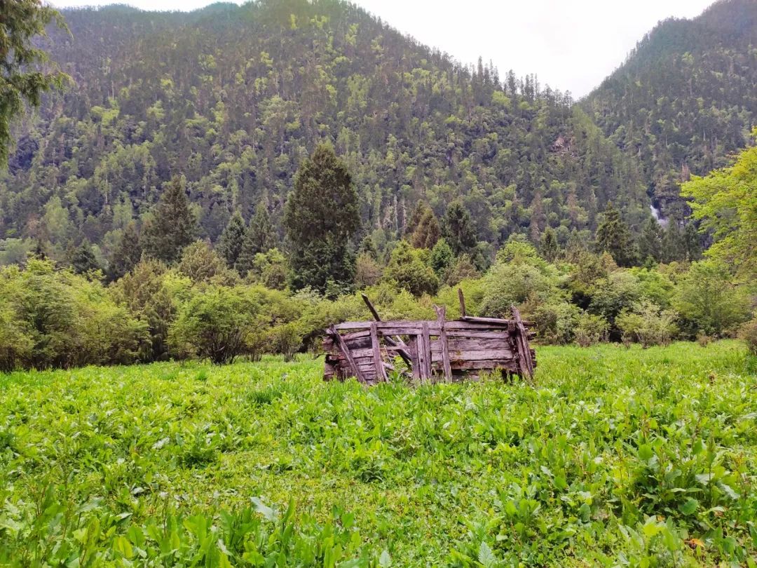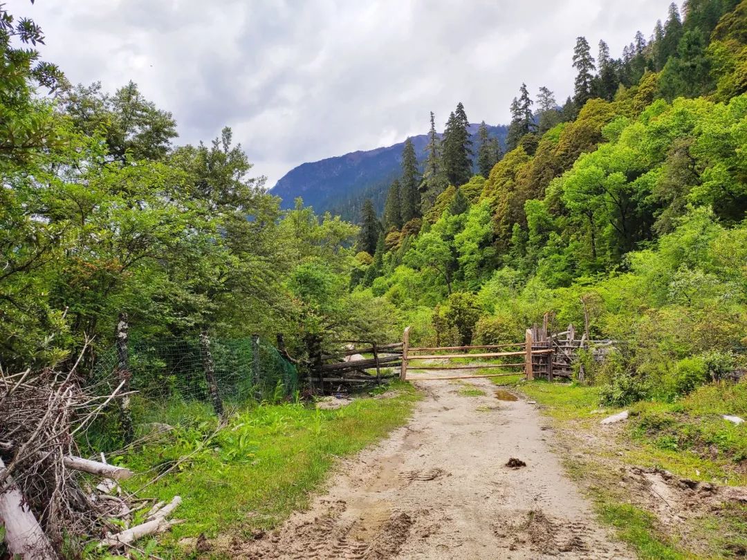 早上九点离开龙普村,踏上了翻越觉姆垭口的征程。出发不久我就遇到了一个骑摩托车的藏族小伙子,我向他询问能否翻山走到巴松措,他说这个季节不行。守队原本设计的从龙普村到巴松措是有两个垭口可以选择的,我这次只走位于西边的觉姆垭口,而位于东边的久褥垭口是备用垭口。走到村头的时候我朝备用垭口的山谷方向看了看,这个山谷植被茂盛,并且在山谷入口处就有一个很陡的坡度,所以当时我就打消了走备用垭口的想法。