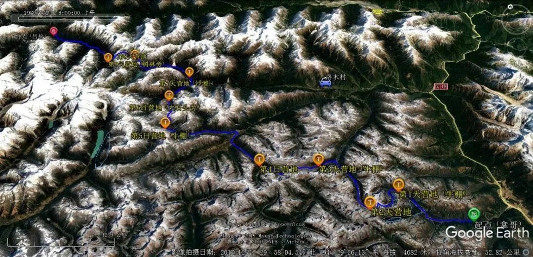 俗话说,“知己知彼百战不殆”,你去走一条从未有人走过的山谷时一定要做好充分准备。今天是比较有强度的一天,我将沿着错果错正对的山谷一路向北,靠着河的右岸逆流而上,走到响打垭口下时再涉水渡河向西翻越响打垭口,下降到位于错布河谷的响打营地。