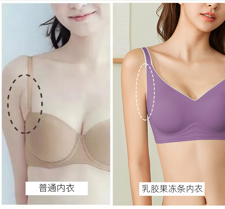 果冻条做成仿钢圈设计,藏在内衣侧比、底围、肩带三处,呈“W”形。