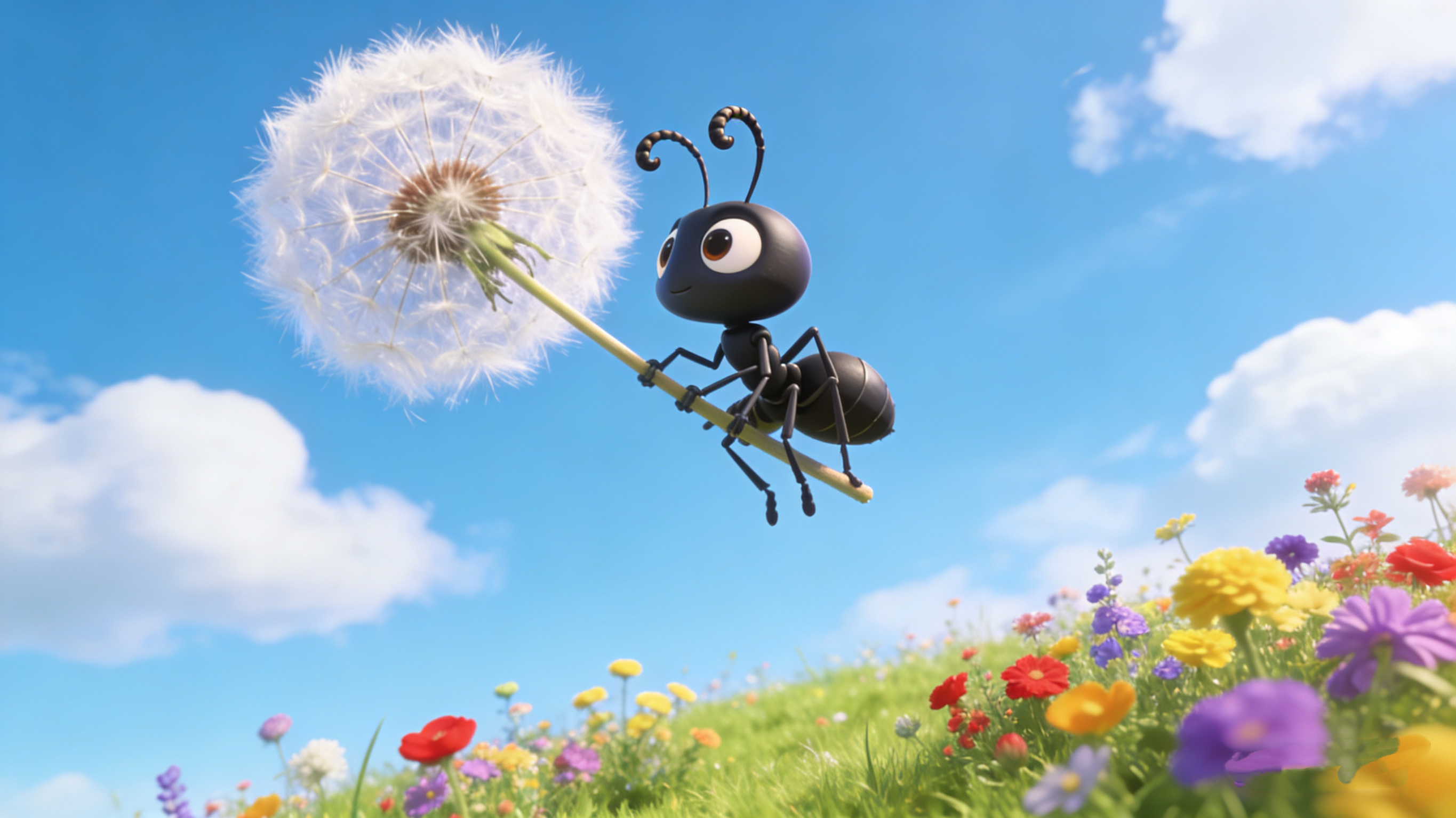 小蚂蚁连忙抓住蒲公英的尾巴,跟着飞了起来。