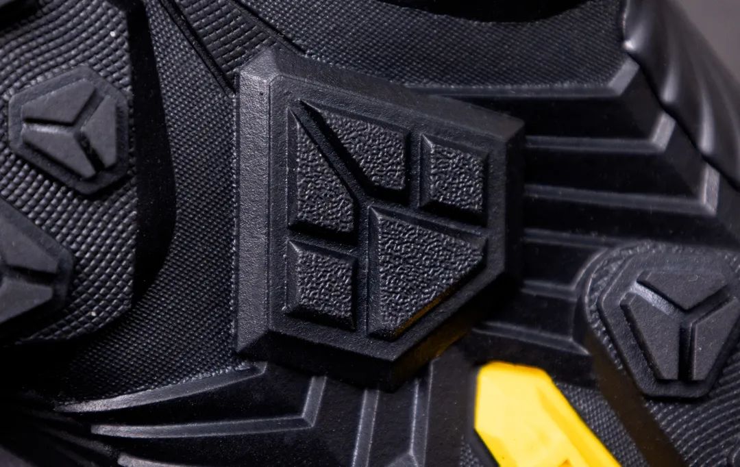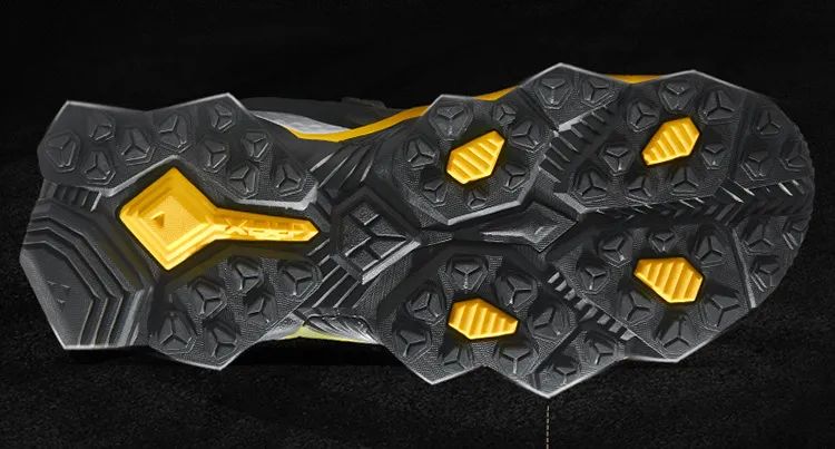 原因在于鞋底:仿生全掌橡胶,加上若干脚钉设计,排泥沟、3D锯齿止滑带,方方面面都顾及到了,摩擦力大,抓力很强。