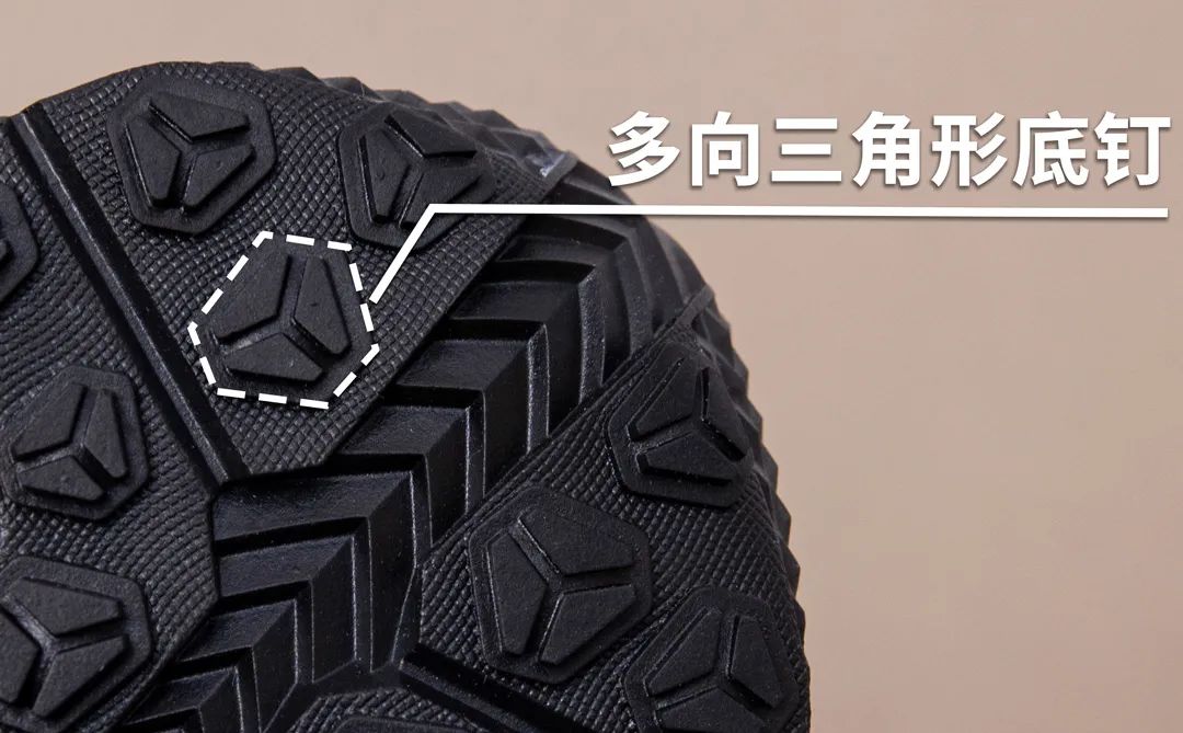 1、抓力强大,防滑出色:鞋底仿生全掌橡胶,鞋底多向三角脚钉、排泥沟、3D锯齿止滑带、狼利爪仿生专利标
