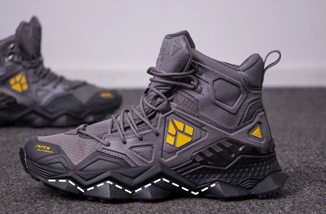 RAX登山徒步鞋,整个鞋底仿生全掌橡胶,凹凸不平,摩擦力大。