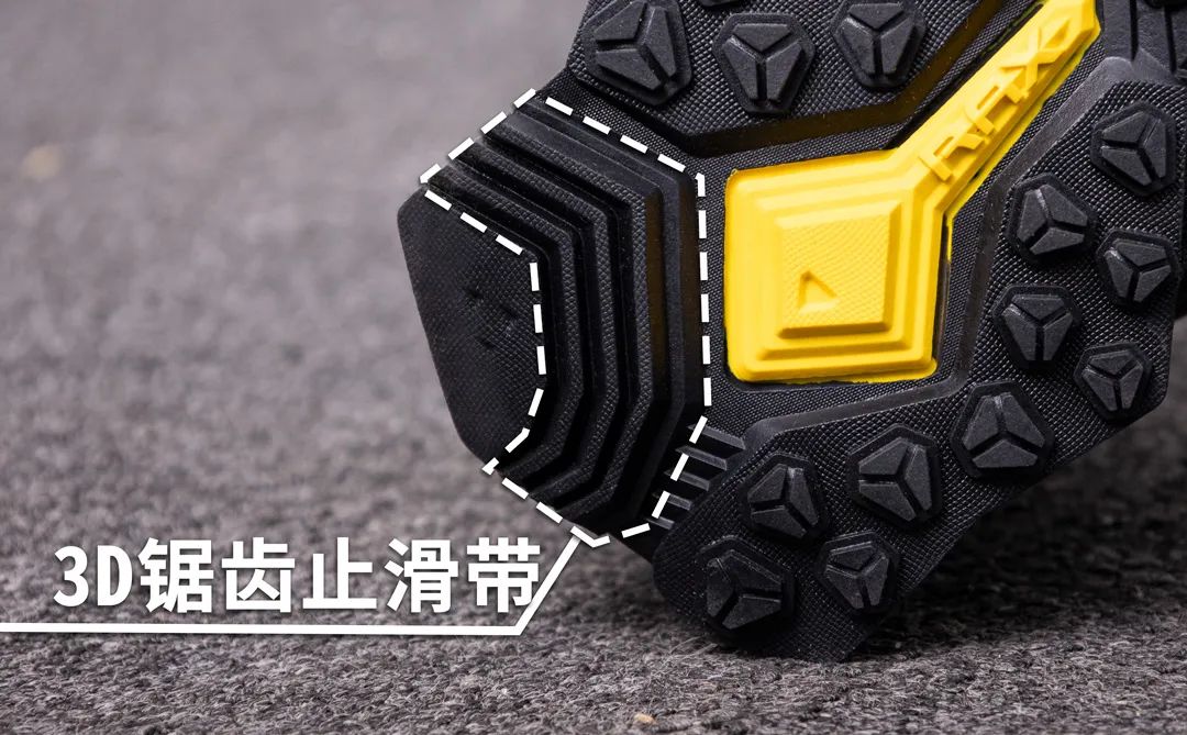 最后一部分是3D锯齿止滑带,在脚后跟处,上下坡使力自然落脚处,有针对性的进行防滑。