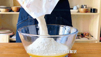 倒入300g面包粉(高筋粉)搅拌成絮状