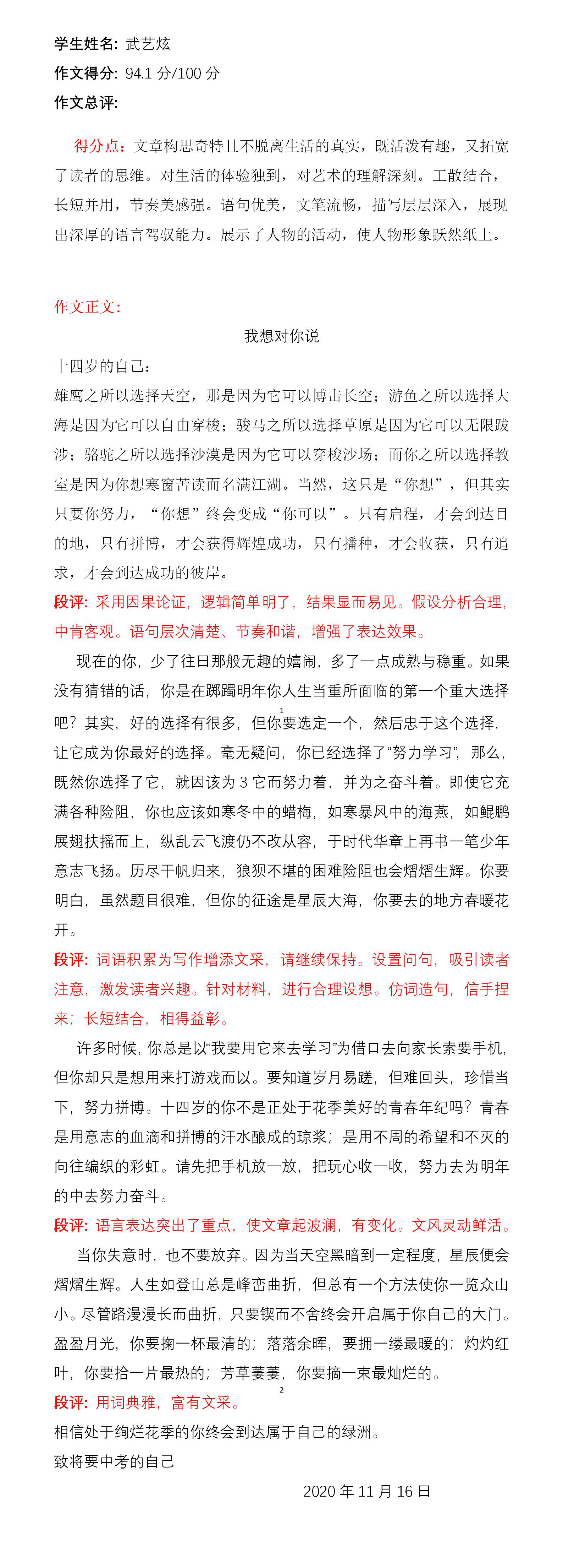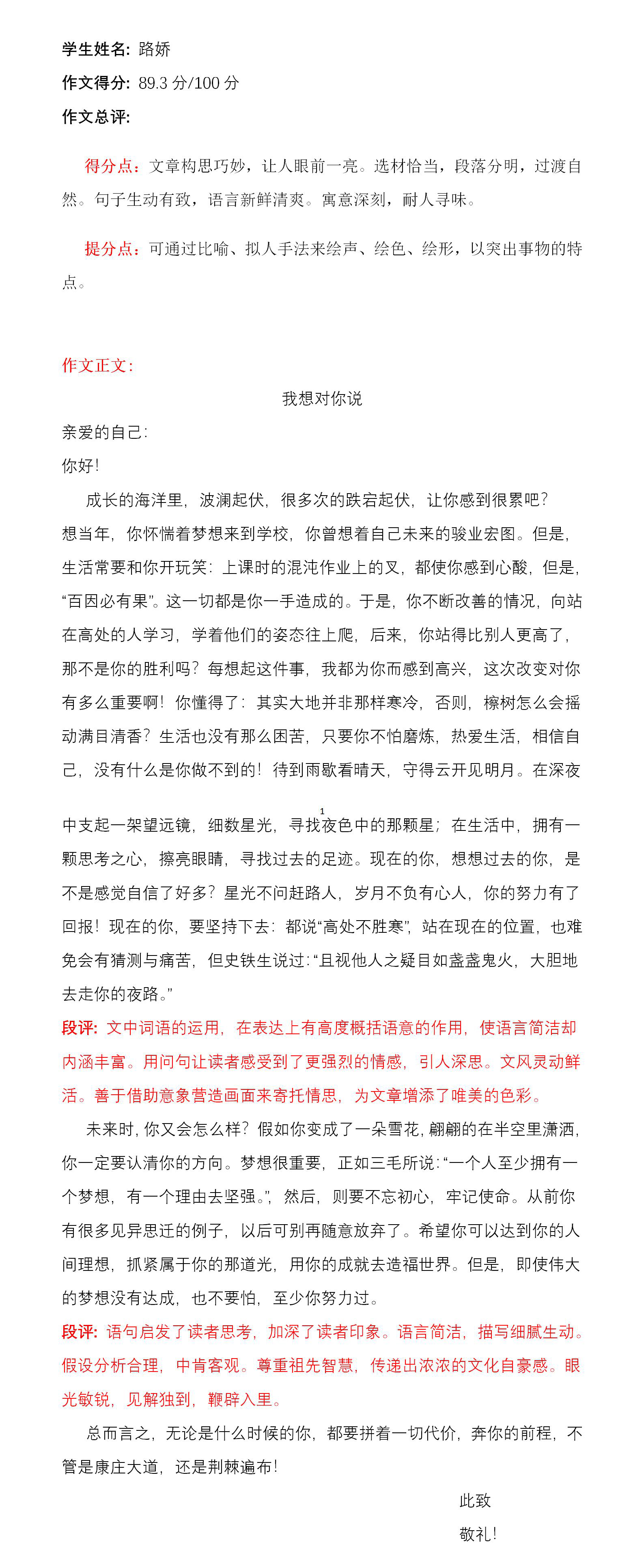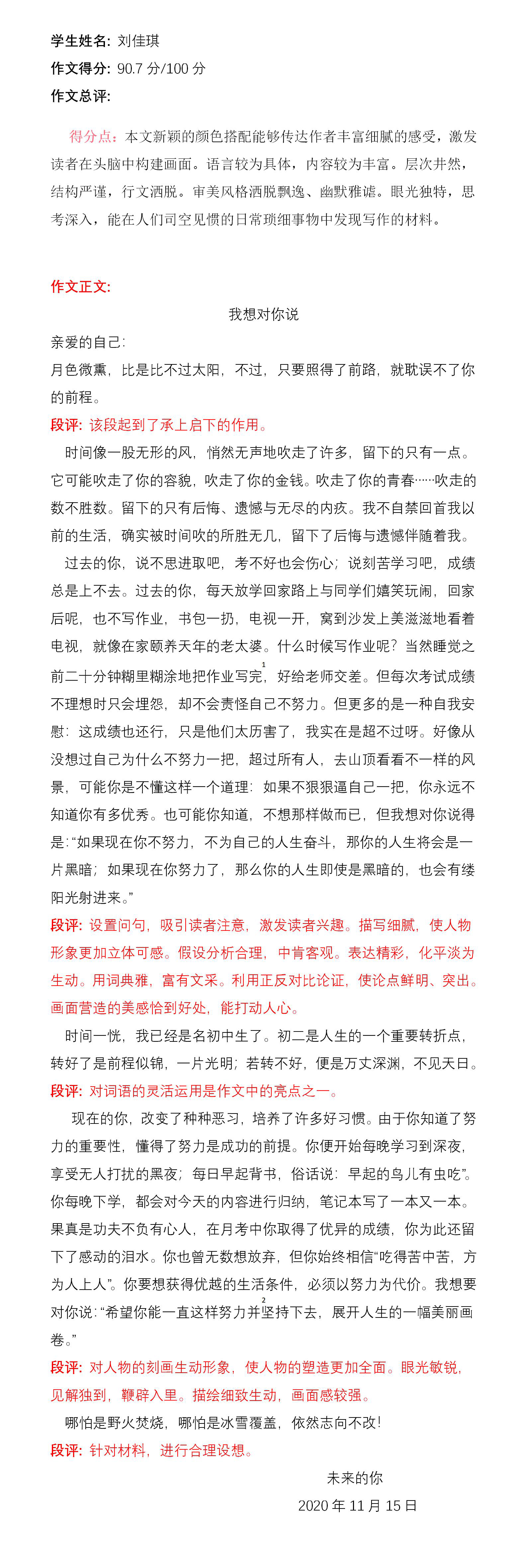 艺炫,老师想对你说:三年前的那个小姑娘越来越靓丽了。靓丽的不仅是外表,是成绩,是为人,是心灵。勇于追梦的人更靓丽。我们的人生需要用梦想去点燃。“只要你努力,你想终会变成你可以!”