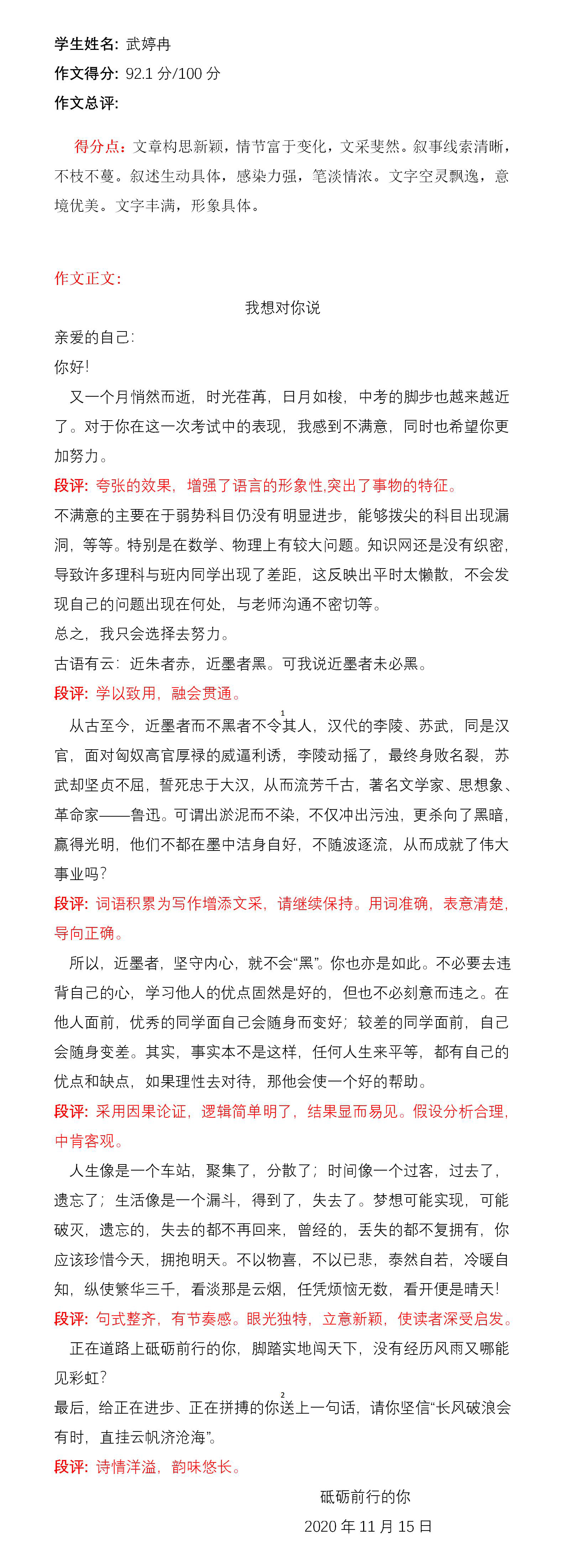 武婷冉同学是个很有悟性的女孩。在本篇习作中,她从自身的失败中找原因,由个人得失联想到古仁人的成败,进而用诗一般的语言完成了自我的完美蜕变,结尾用李白的诗来勉励自己砥砺前行,完成了文意的升华。