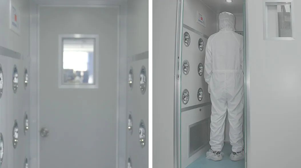 更衣消毒后,在进入车间前还必须经过风淋室,完成整个吹淋除尘的过程,有效而迅速清除尘埃粒子,避免身上的尘源进入洁净区带来污染问题。