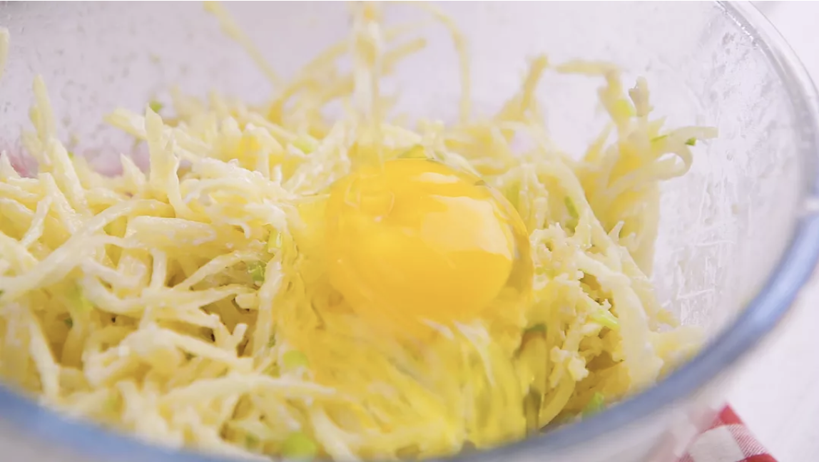 1、土豆丝放入1两面粉,切好的葱花,1勺食用油(喝汤匙勺),2指1捏盐搅拌均匀,然后放入1个鸡蛋再搅拌均匀;
