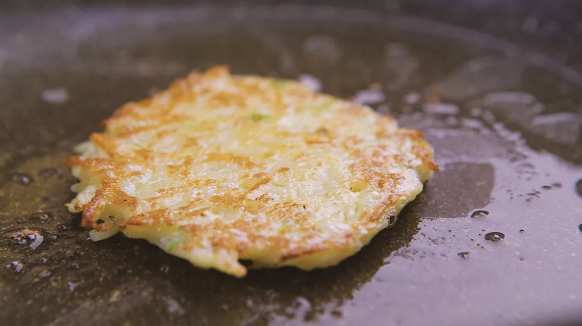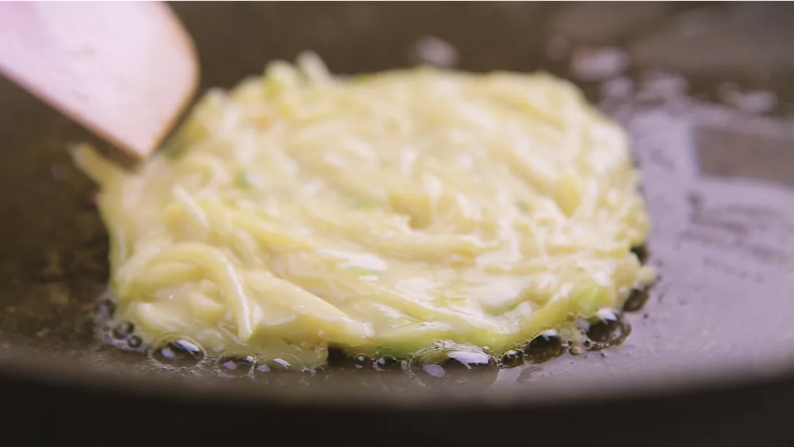 2、锅里放底油烧热后改成小火,放入拌好的土豆丝,用筷子调整成圆形(饼一定要薄)煎制两面金黄;