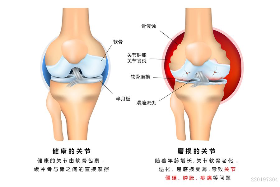 这种摩擦会导致关节疼痛、肿胀甚至丧失运动能力。随着时间的推移,关节还可能会变形,甚至关节的边缘还会长出骨刺。如果骨头或软骨的碎片跑到关节腔里,会导致更多的疼痛和损伤。